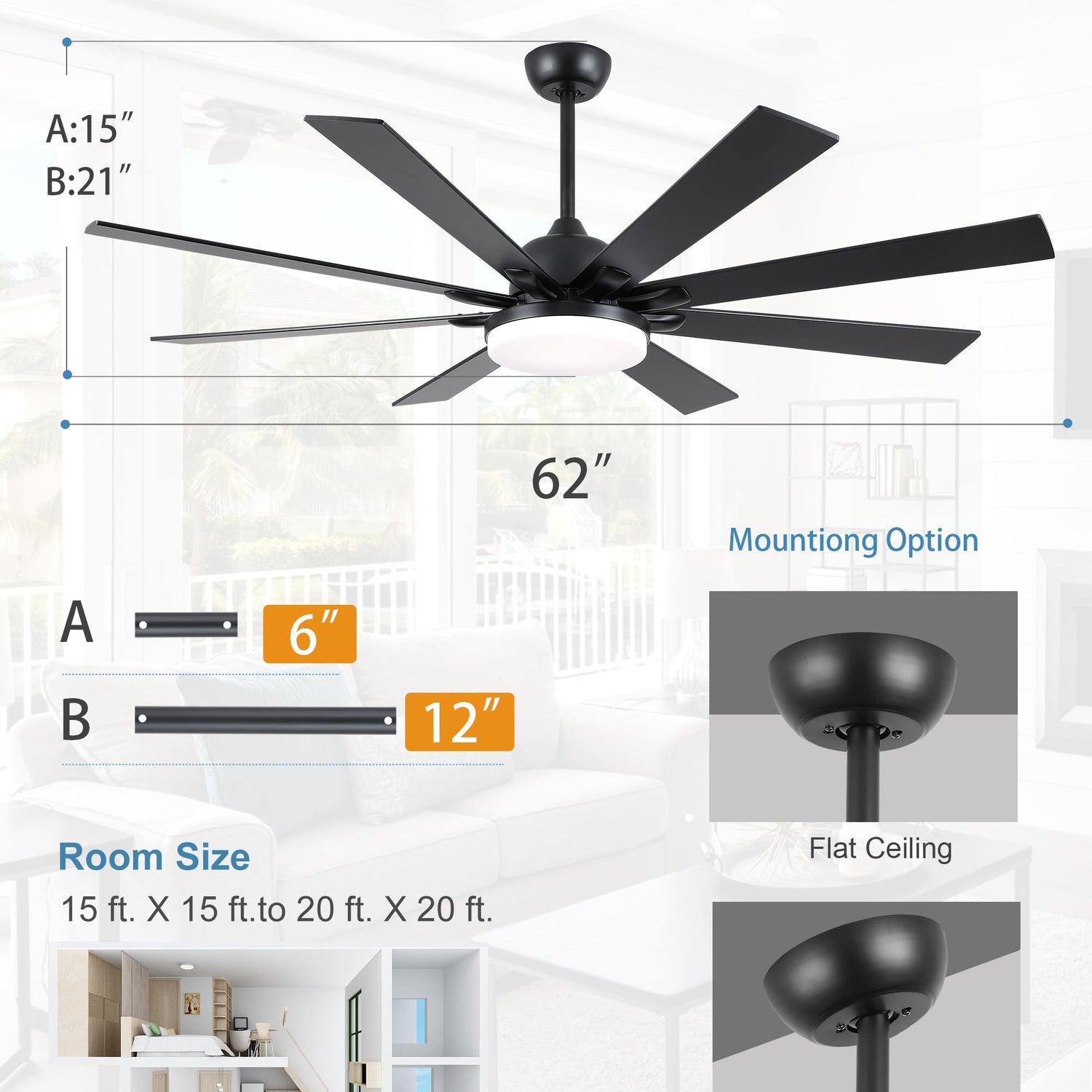 - Large Ceiling Fan: This 62 inch ceiling fan includes 6", 12" down rods, suitable for different ceiling heights. The blades are made of thickened engineering wood,the body is made of thickened metal material,the appearance perfectly blends modern and farmhouse styles, and the design of 8 blades makes the air volume larger and smoother.Ideal for large places (Indoor or Covered outdoor)