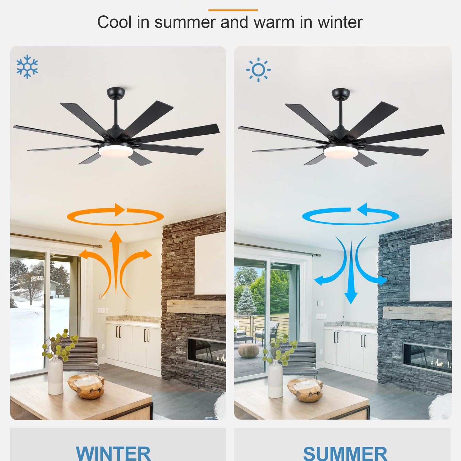- Reversible Ceiling Fan: This ceiling fan with light with reversible function,easily switchable by remote control.In the summer, it runs downdraft mode and has a good airflow of over 7000 CFM to keep you cool and get rid of the summer heat. In the winter, it runs in updraft mode to rotate and circulate warm air during winter. Whether you're looking to cool down a stuffy room in the summer or circulate warm air in the winter, this large ceiling fan is the perfect choice