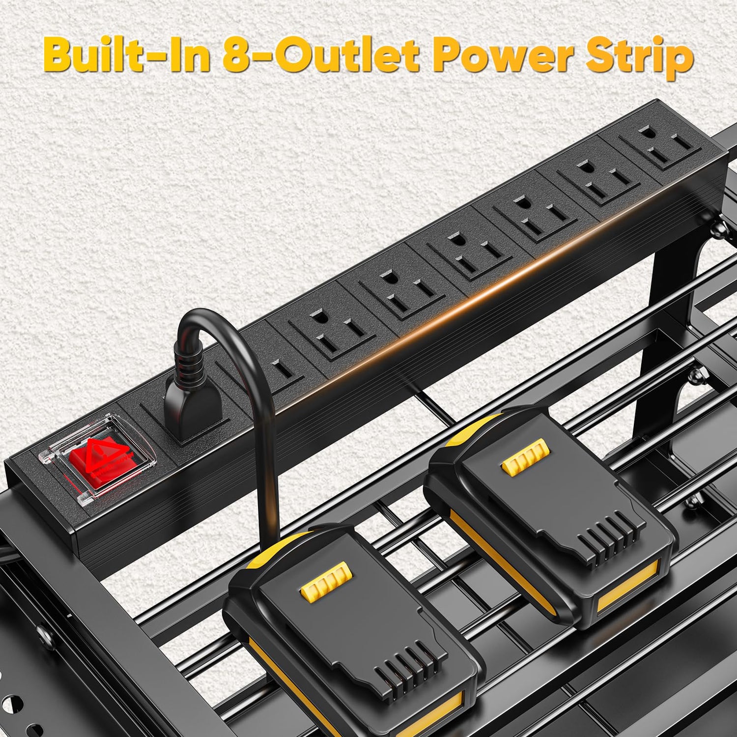 - Built-In 8-Outlet Charging Station: Stay powered up with the integrated tool rack featuring an 8-outlet power strip with 1200J surge protection and a 6.56-foot cord. This cordless tool organizer lets you charge multiple battery packs simultaneously, maximizing your garage workflow efficiency.