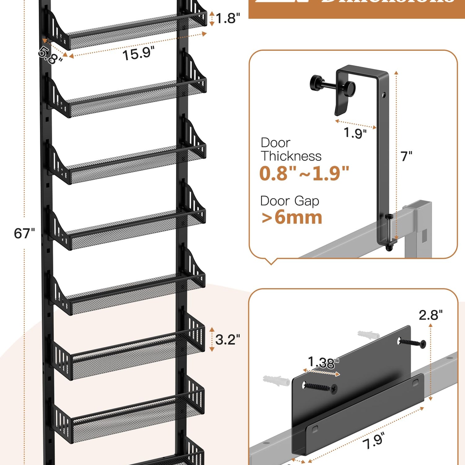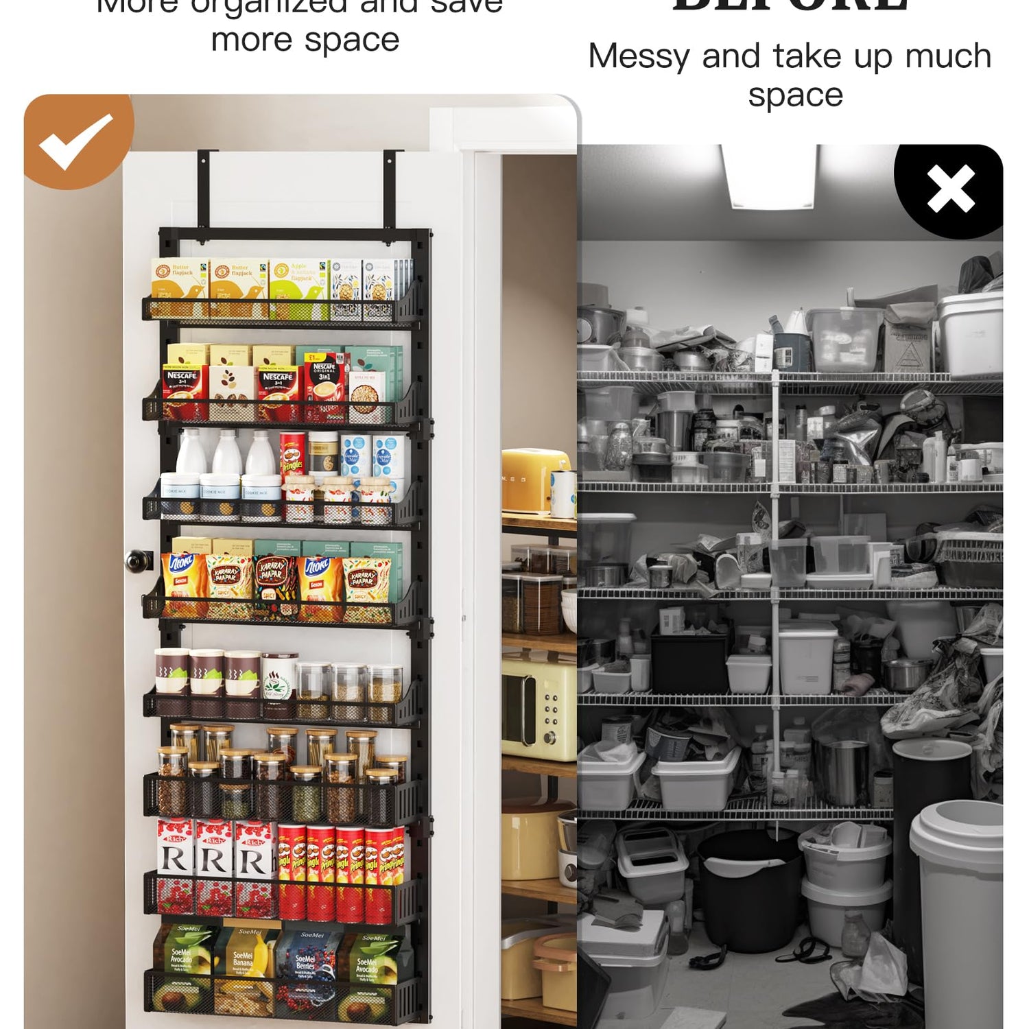 - ADJUSTABLE SHELF HEIGHTS FOR VERSATILE STORAGE: With 5 baskets measuring 9/5 inches in height and 3 baskets measuring 16/5 inches in height, our over the door organizer is perfect for storing different-sized spice jars, snacks, and more. The 3 taller baskets are specifically designed to secure taller items and prevent them from falling.