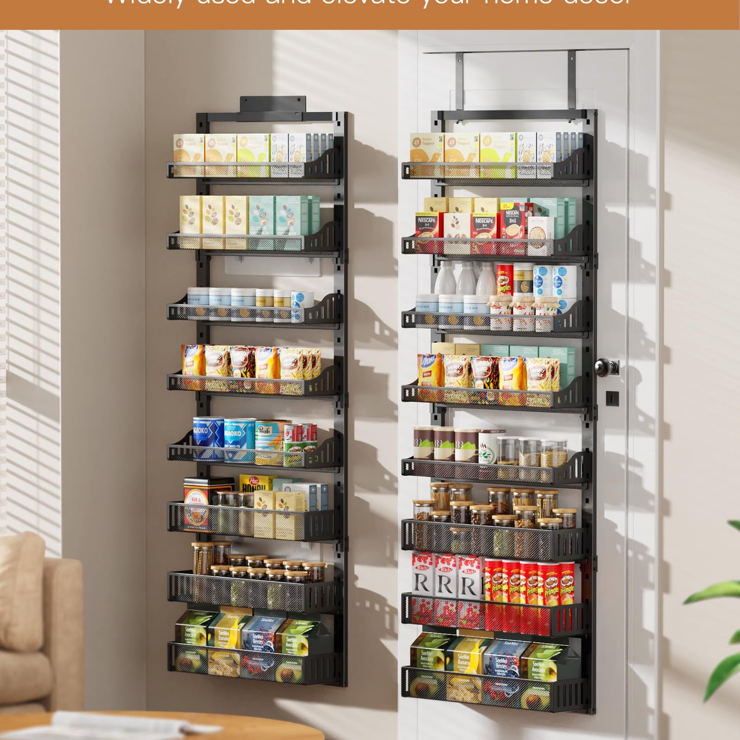 - TWO MOUNTING OPTIONS FOR FLEXIBILIT: Our organizer can be hung over the door or mounted on the wall, making it suitable for storage rooms, kitchen cabinets, living room walls, and more. The over the door mounting option comes with adjustable door hooks to accommodate door thickness ranging from 1/20 to 2 inches. It's easy to assemble and install in just 10 minutes.