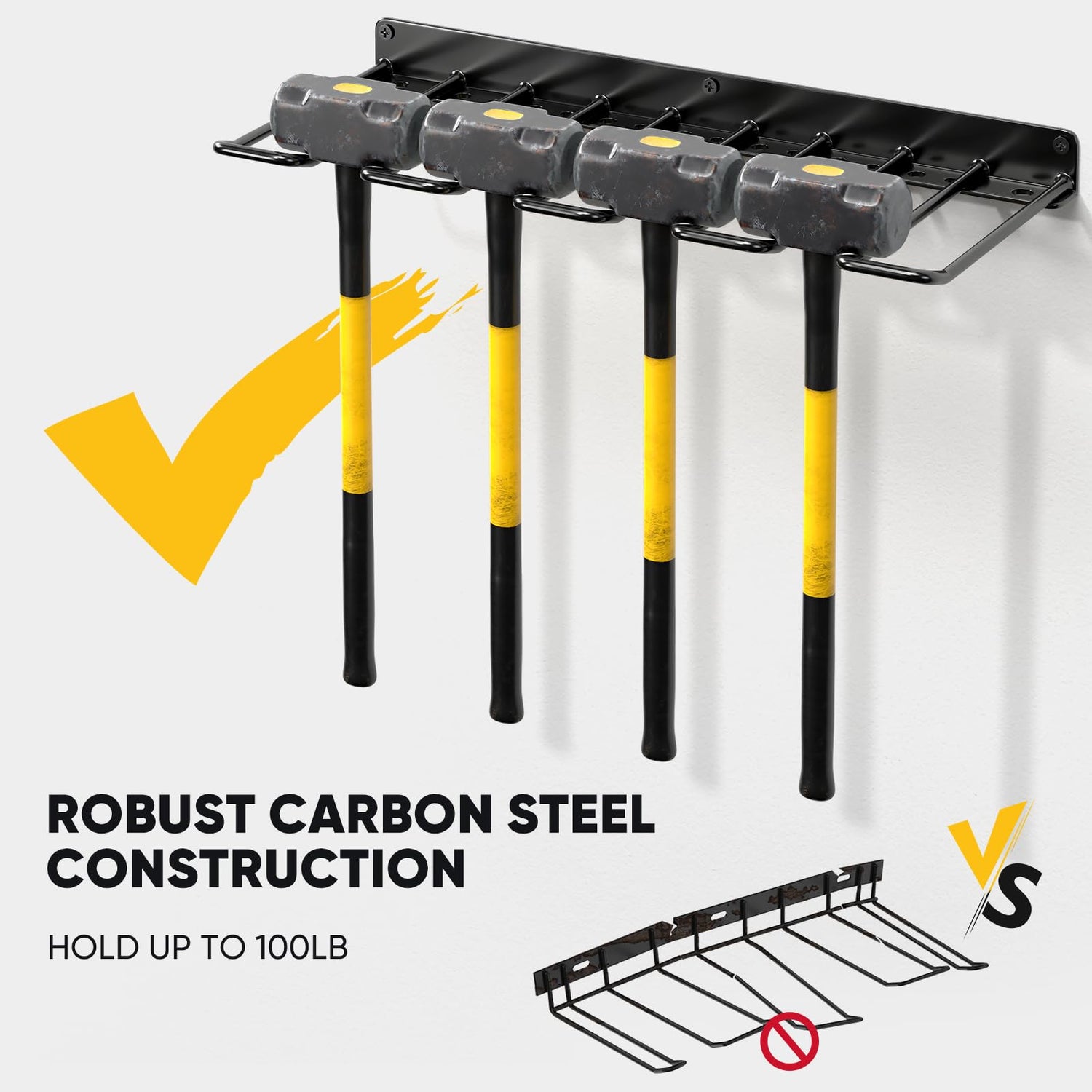 - THICKENED AND REINFORCED DESIGN: The heavy-duty designed garage tool rack takes into account the size of 16-inch studs while helping us load tools weighing up to 50 pounds using 2 wall-mounted anchors.