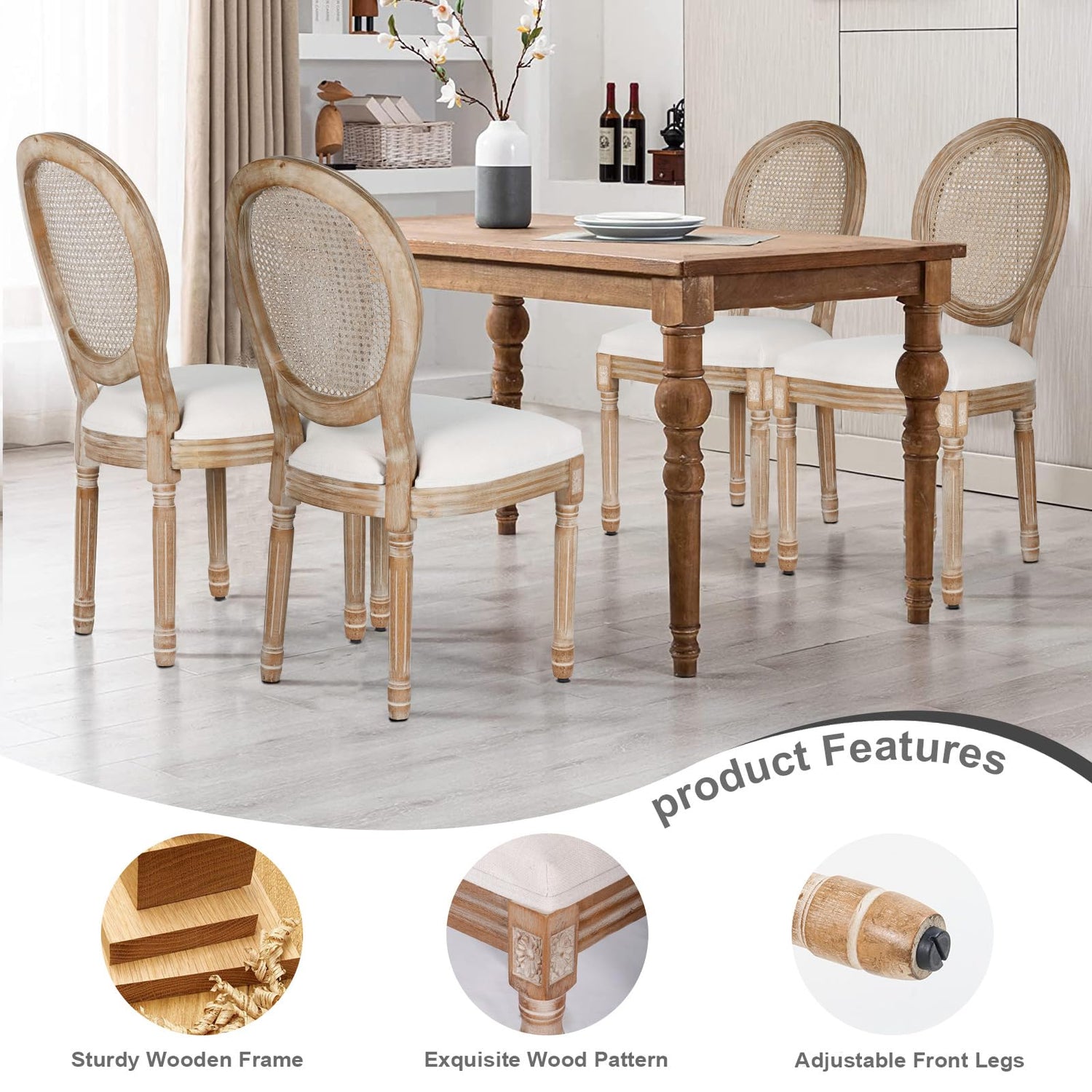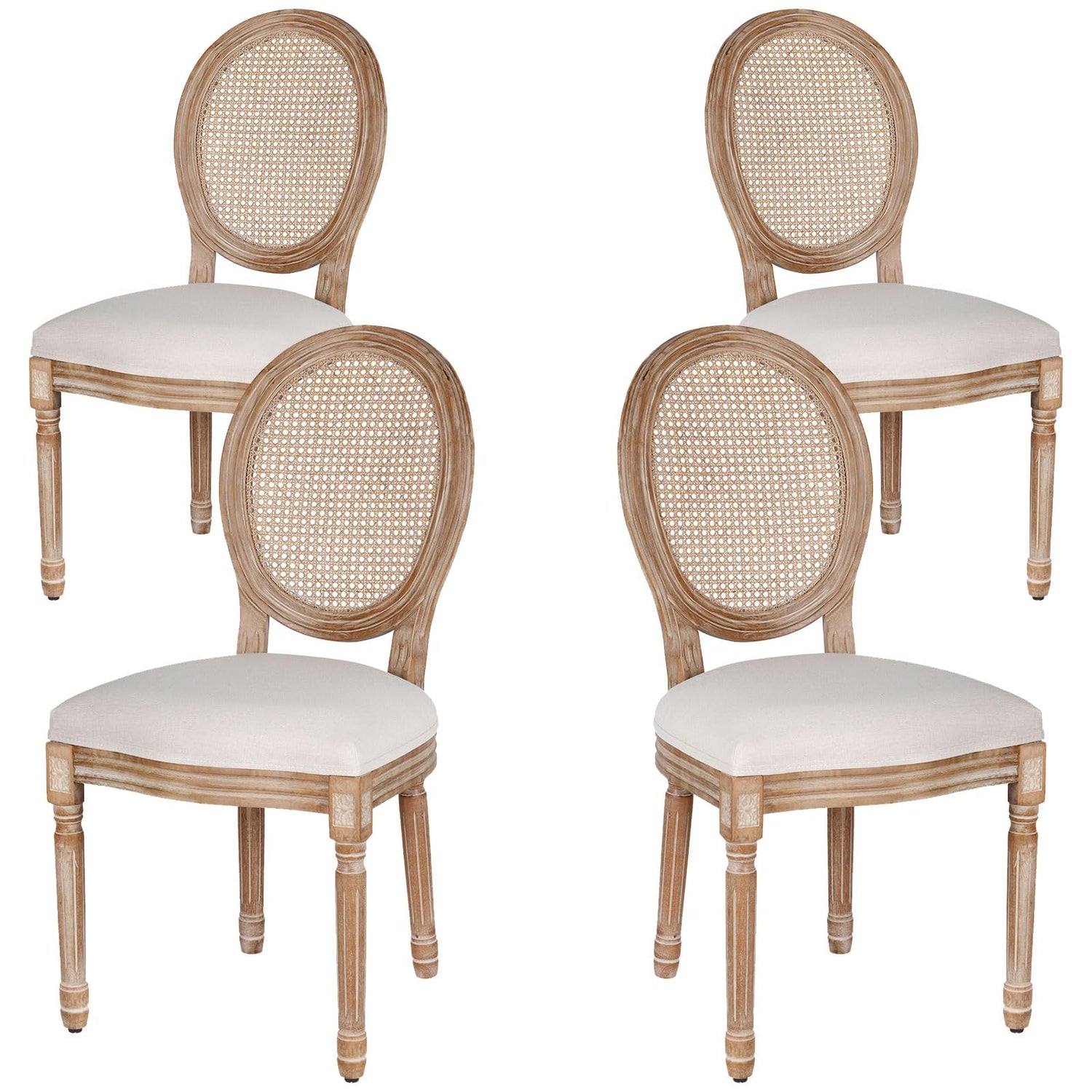 Polar Aurora Dining Chairs Set of 4 Beige Rattan Round Back with Solid Wood Legs and Frame for French Country Kitchen Dining Room