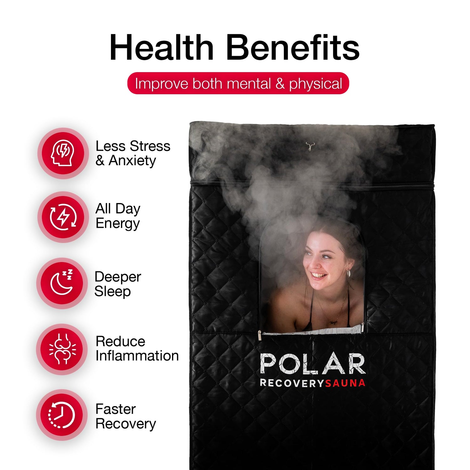 - ❤️ Exceptional Wellness Benefits - Discover ultimate relaxation with Polar Recovery's efficient and fast-heating portable steam sauna. Expeirence benefits such as, better sleep, reduced stress, improved ciculation, glowing skin and iproved health. Enhance your sauna sessions with our essential oil diffuser.