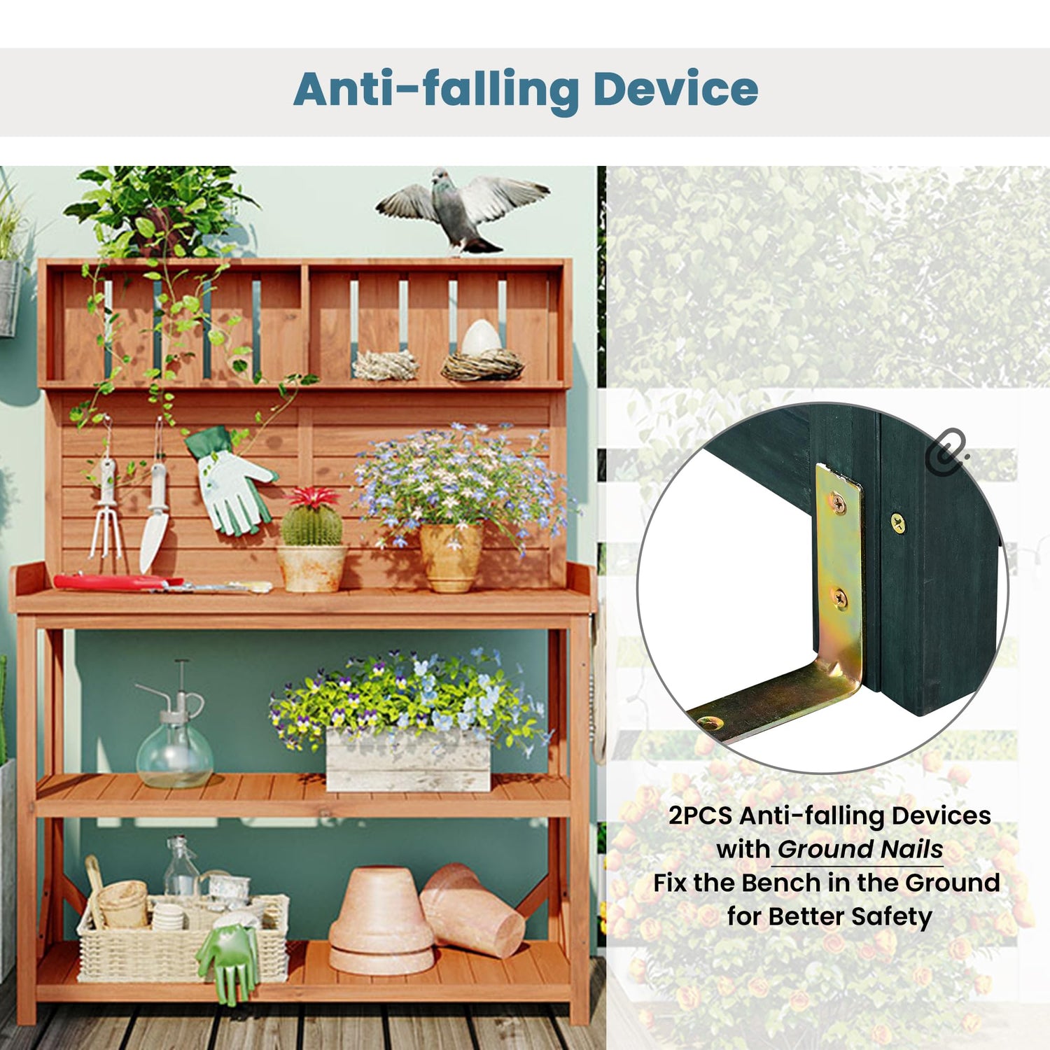 - 【Anti-Falling Safety Device】There is not always flat in the garden. For your safety in setting the potting bench, it is designed with an anti-falling device. There are two anti-falling devices with ground nails which can fix the bench in the ground for better safety.