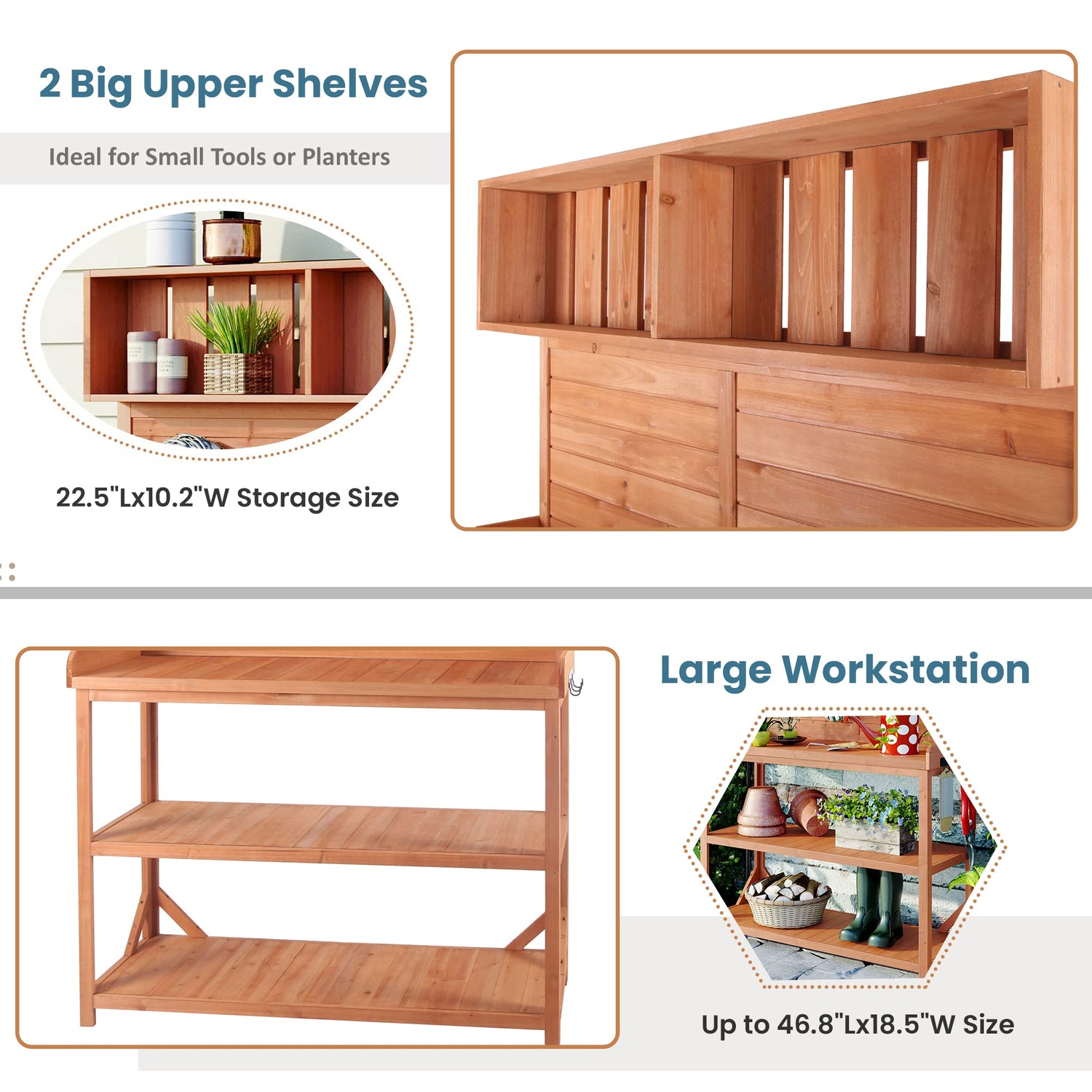 - 【Outdoor Workstation】Made of 100% fir wood, this table is sturdy enough for outdoor using with its 46.8x18.5inch workstation. Compared with other potting bench, its surface is spacious for putting many tools or planters from your loved garden.