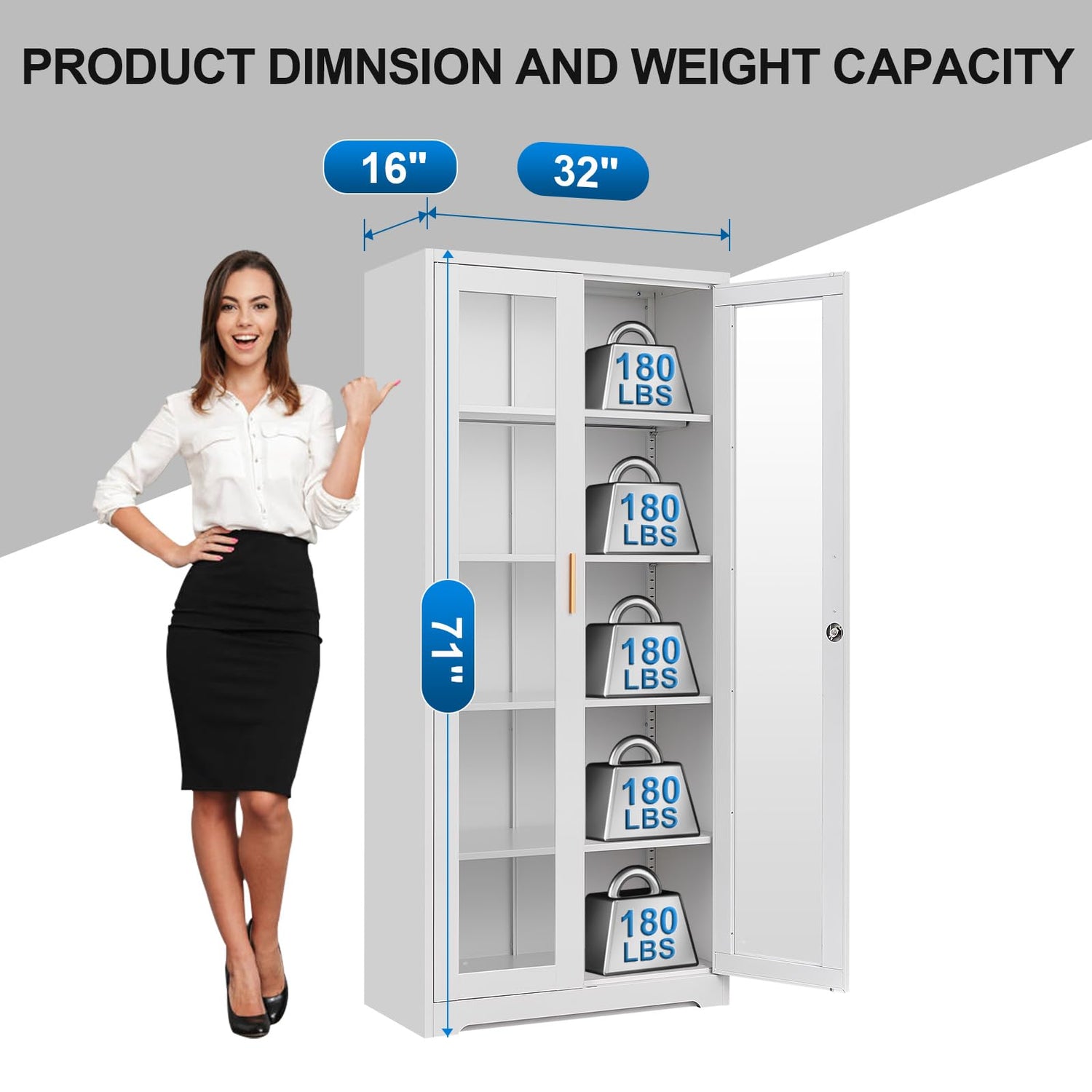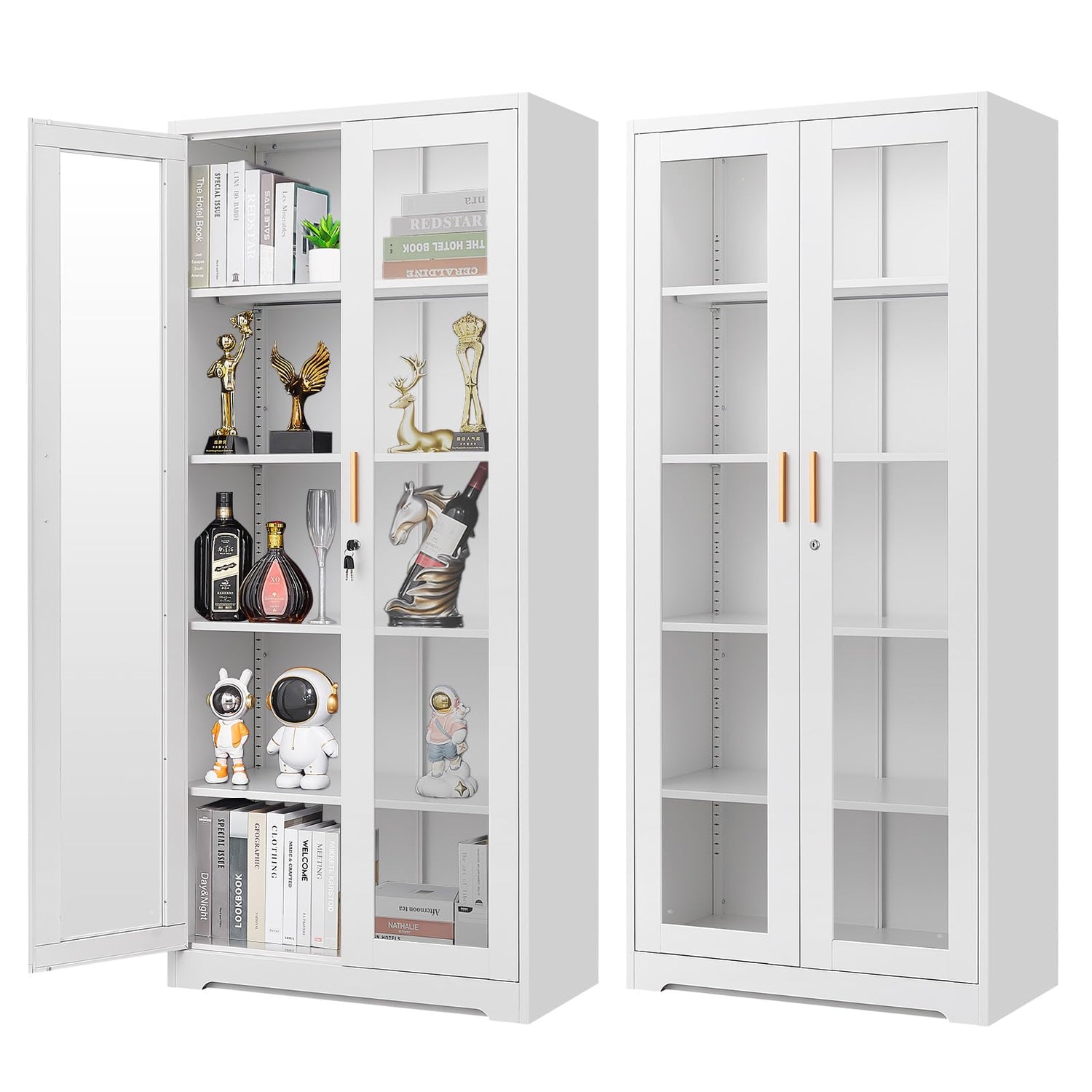 Polup Display Cabinet with Glass Doors, Metal Curio Cabinets with Lock and Shelves, 71''Tall Display Case for Living & Dining Room, Bookcase for Home, Clinic, School (White)- Assemble Required