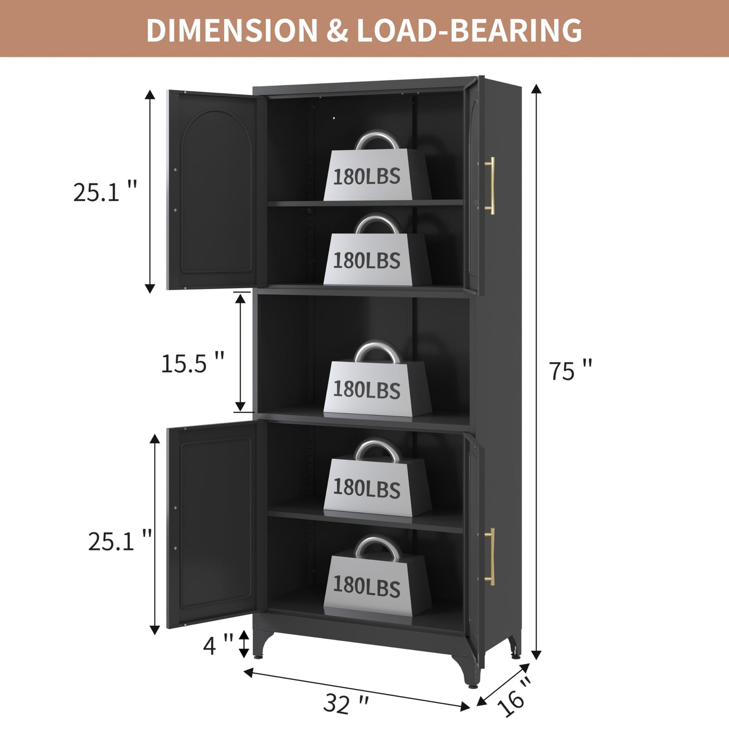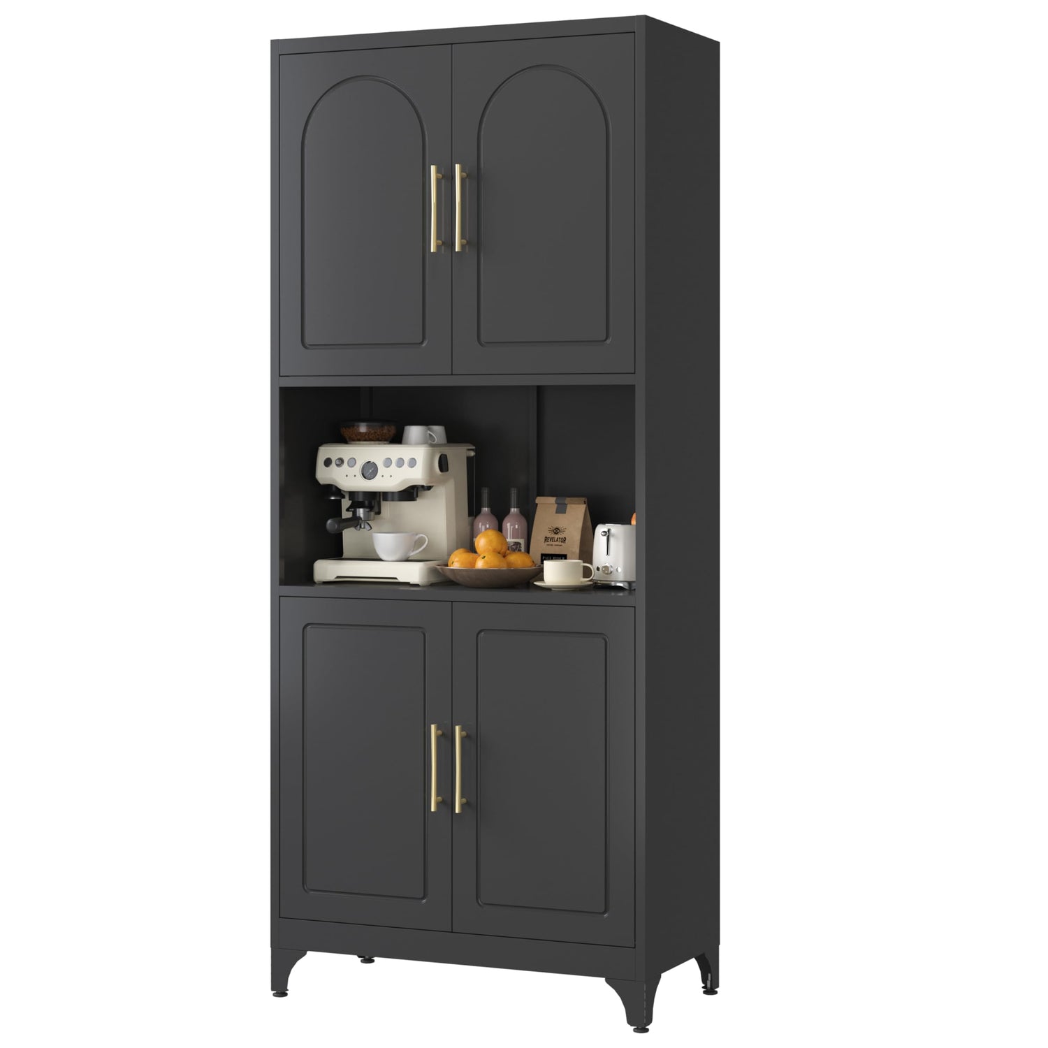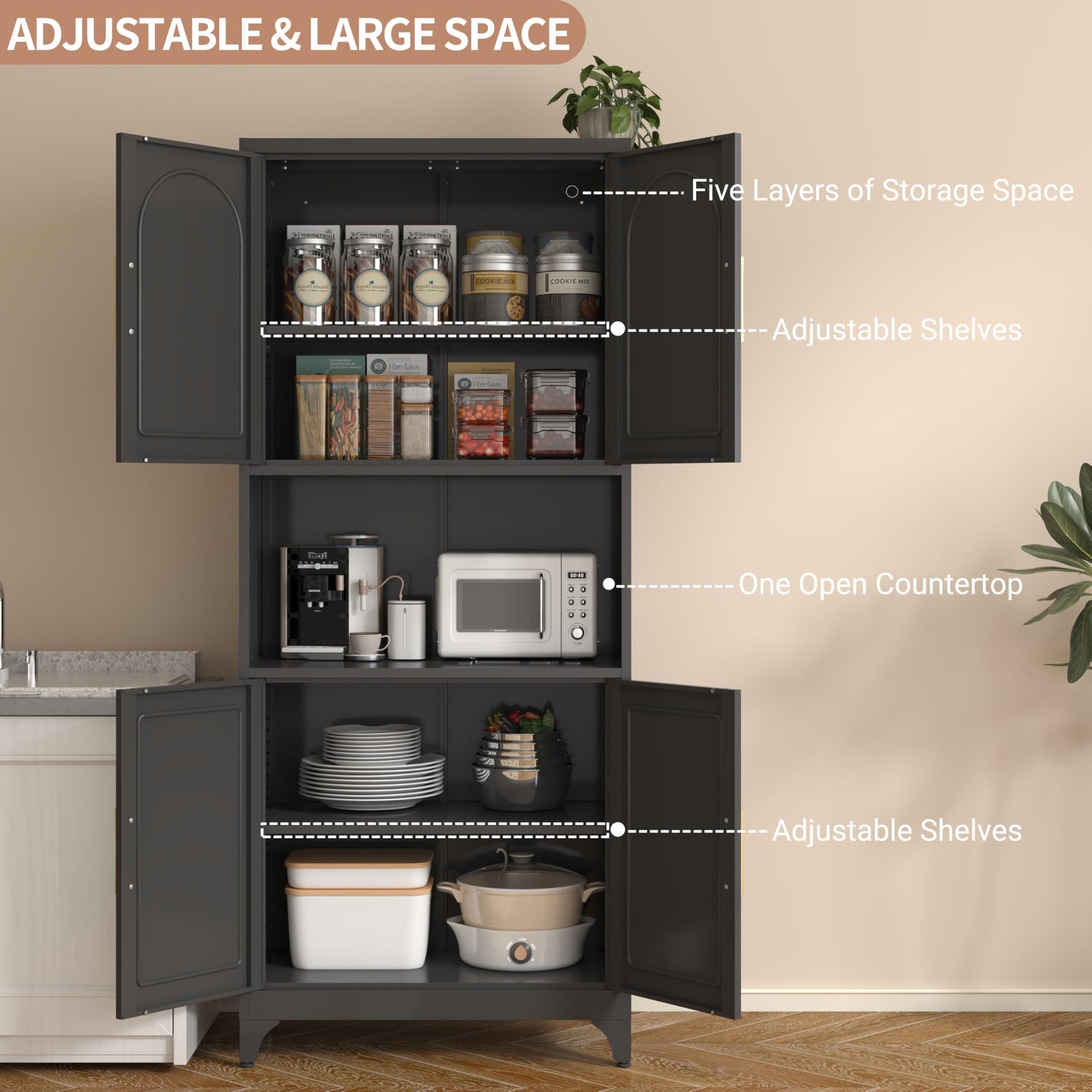 Polup Kitchen Pantry Cabinet, 75" H Kitchen Hutch with Microwave Stand, Food Cupboard with Countertop, Metal Storage Cabinet with Doors and Shelves for Living & Dining Room, Black - Assemble Required