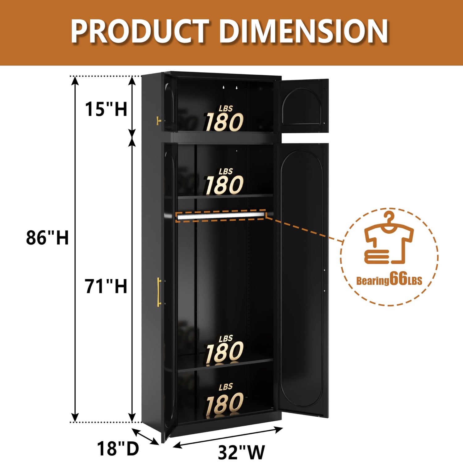 Polup Metal Armoire Wardrobe Closet, 86 Inch Tall Freestanding Wardrobe Cabinet with Hanging Rod, Bedroom Armoires with Doors, 18" D x 32" W x 86" H, Black, Assemble Required, Shipped in Two Packages