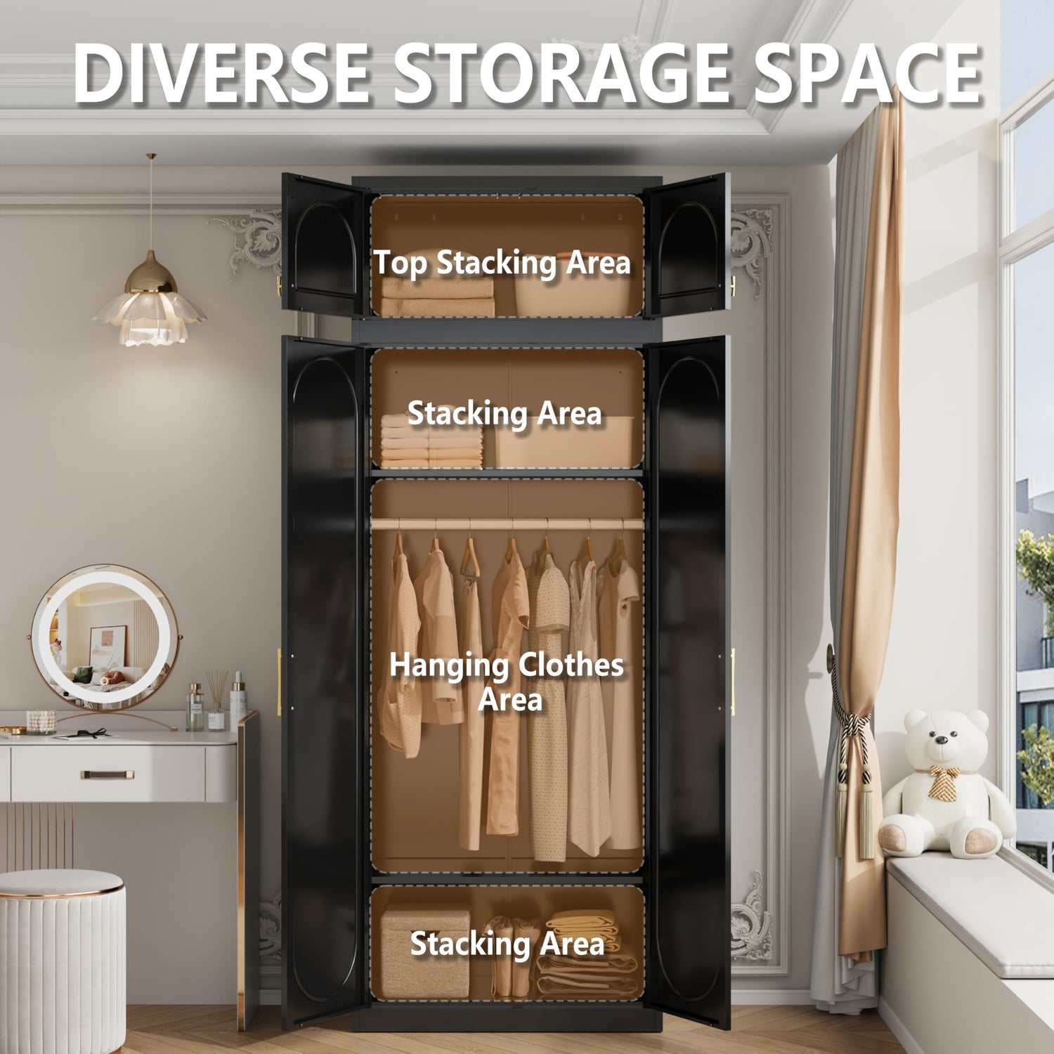 - [PREMIUM MATERIAL] Made from thickened steel with a powder-coated finish, this armoire wardrobe closet is waterproof, moisture-proof, and rust-resistant, ensuring long-lasting use while protecting your clothes from wear and damage