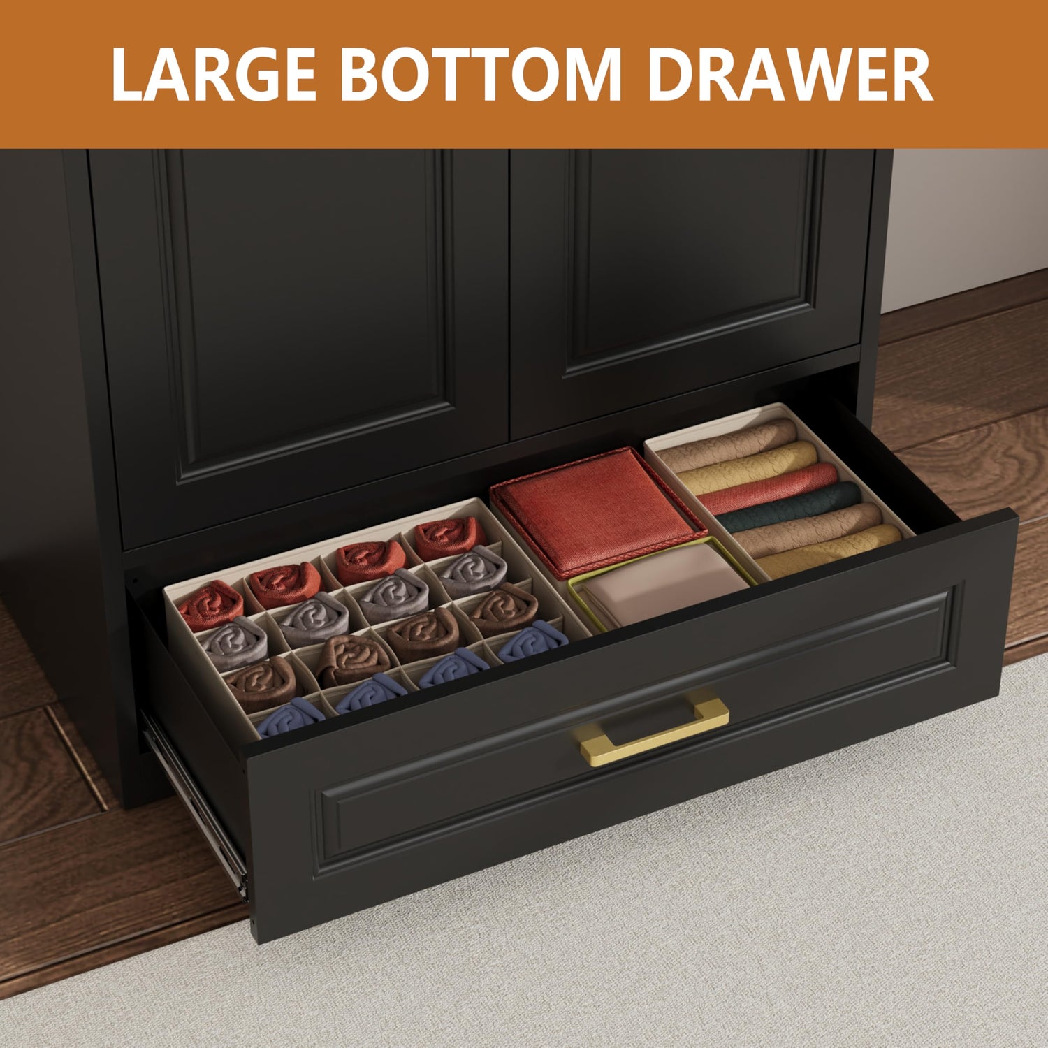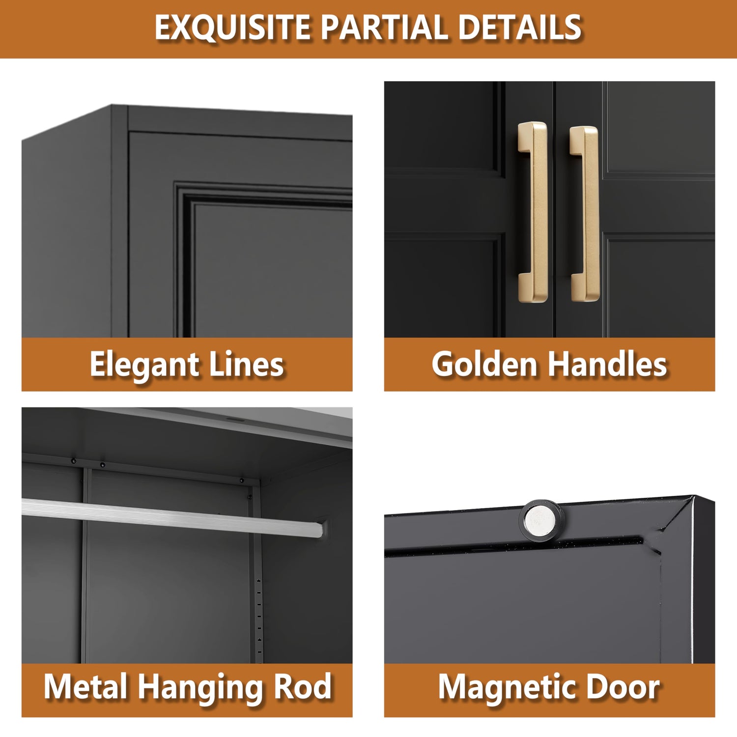 - [PRACTICAL DETAILS] This black wardrobe incorporates several ingenious features. Anti-tip devices keep it securely in place, preventing accidents. Adjustable feet allow it keep to level on uneven floors. Additionally, the built-in magnetic doors ensure close automatically, adding convenience to your daily use