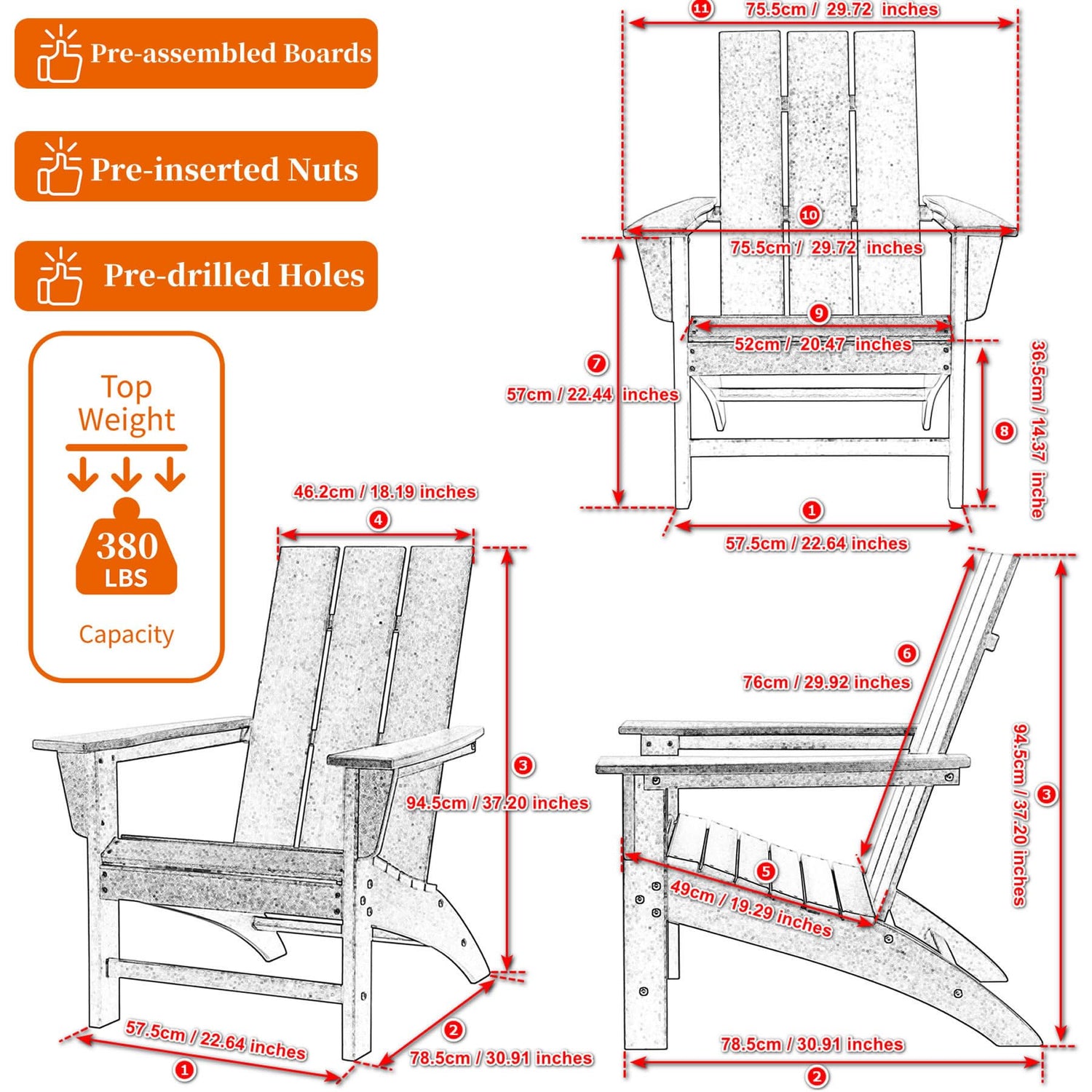 - Product Measurement: This Adirondack Chair's overall dimension is 22.64 x 30.91 x 37.20 inches (W57.5xD78.5xH94.5cm), Weight Capacity: 380 lbs.