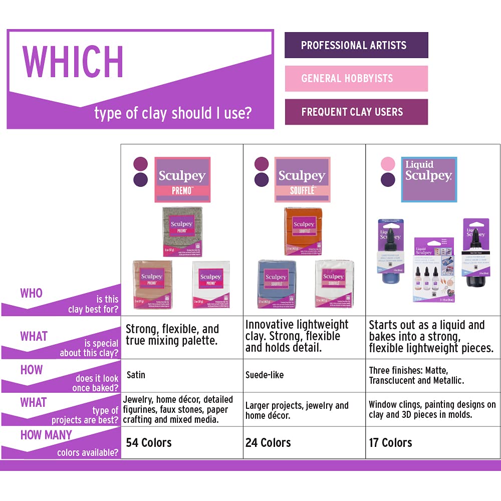 Details: Versatile - Sculpey Soufflé is an innovative lightweight clay that after baking, has a beautiful suede finish. It is super flexible and can be cut and sewn after baking – perfect for embellishing bags, making tags, enhancing paper crafting and more! Polymer oven-bake clay is a versatile medium that is perfect for crafters/makers of all ages. This clay is perfect for jewelry making, holiday, DIY, mixed media and larger home décor projects.Polymer Oven Bake Clay - Sculpey Soufflé clay conforms to ASTM D-4236 and EN 71 safety standards, it is non-toxic and safe to use in your home oven. Simply make your polymer oven bake clay creation and bake in your home or toaster oven at 275 °F for about 30 minutes depending on the size of your creation. After baking, it can be sanded, drilled, carved and painted with water-based acrylic paints. This oven bake clay will not dry out, so you can take your time crafting and not have to rush to finish your projects like you do with air dry clay. Once baked, Sculpey Soufflé oven-bake clay assumes a smooth suede-like finish. Maximum creativity - This clay is strong and holds detail making it the perfect choice for advanced techniques like caning, mokume gane and bargello. It comes in 24 fashion trend colors, you can also mix them together to get your own unique color palette.