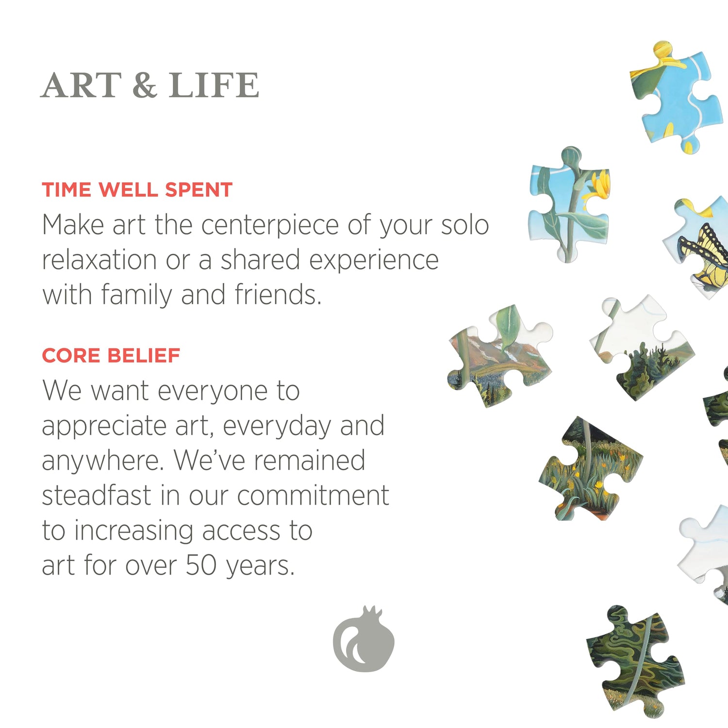- Intentional Design: Known for beautiful art and a snug fit, each Pomegranate 1000 piece puzzle is designed with care in Portland, Oregon.