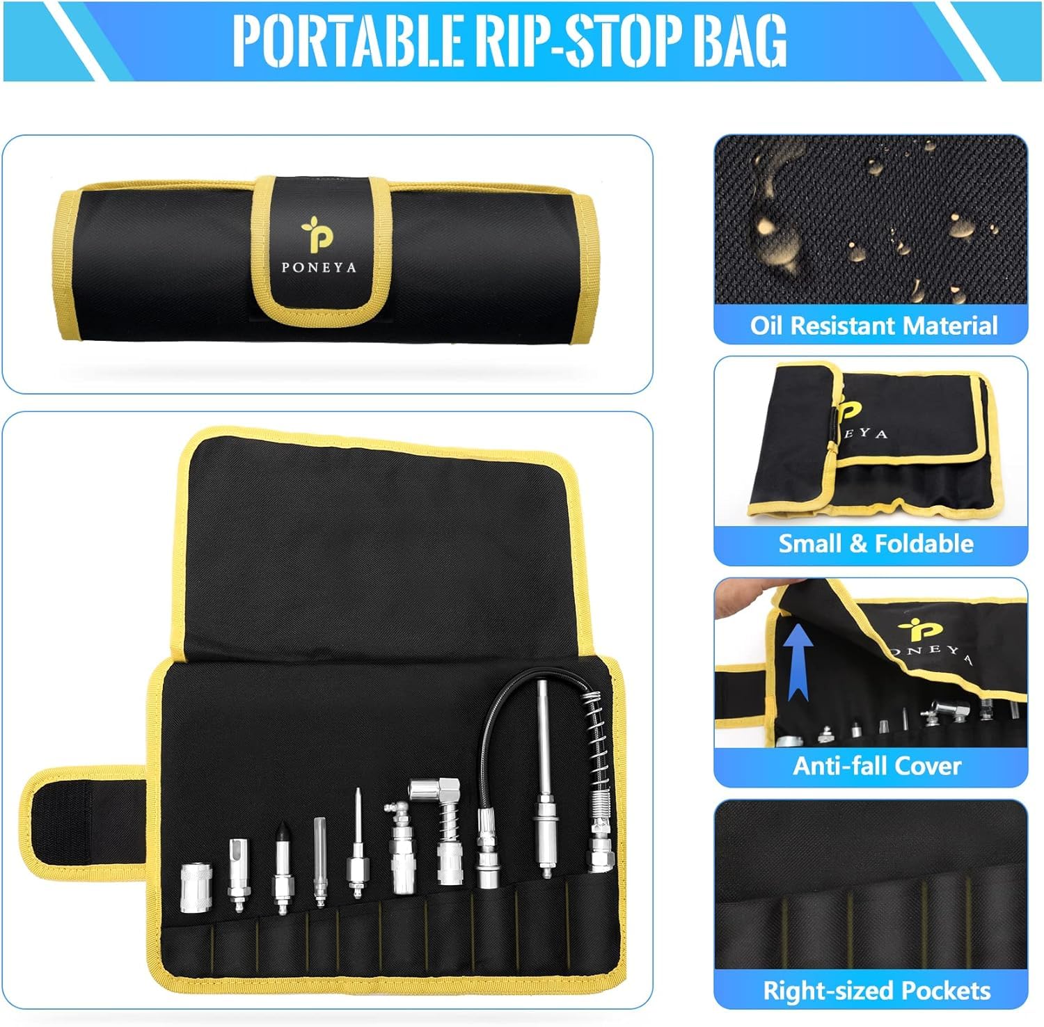 PONEYA 9 PCS Grease Gun Couplers, Quick Connect Greasing Accessory Kit with Grease Gun Tips 12" Flex Hose & Roll Up Case, Perfect for Quick Release Grease Couplers to Reach Any Grease Fitting