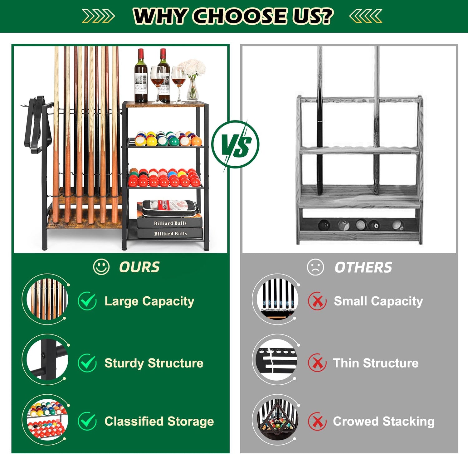- Well-designed Pool Stick Holder: This billiard storage is thoughtfully designed for specific use scenarios to maximize space utilization.We can accommodate up to 12 pool cues, and 2-tier pool ball storage can hold at least 24 balls per tier, totaling at least 48 balls. Additionally, there are two shelves for storing more billiards accessories such as triangle racks,chalk and cleaning supplies, ensuring all essentials have a tidy and organized storage space