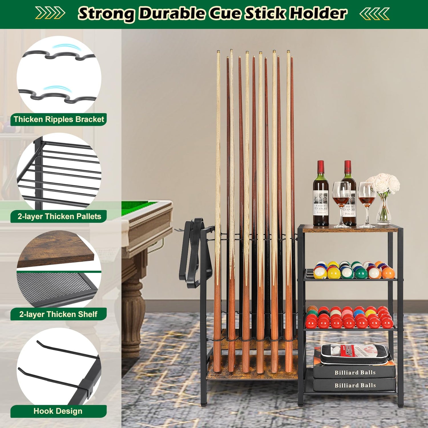 - High-quality Materials: The entire cue stick holder is constructed from reinforced high-density fiberboard and premium, durable powder-coated alloy steel, ensuring robustness and excellent load-bearing capacity. You won't have to worry about bending issues. This pool cue stand is built to last a lifetime, making it both highly durable and stylish. For those setting up an activity room, this billiard cue rack should be their top choice