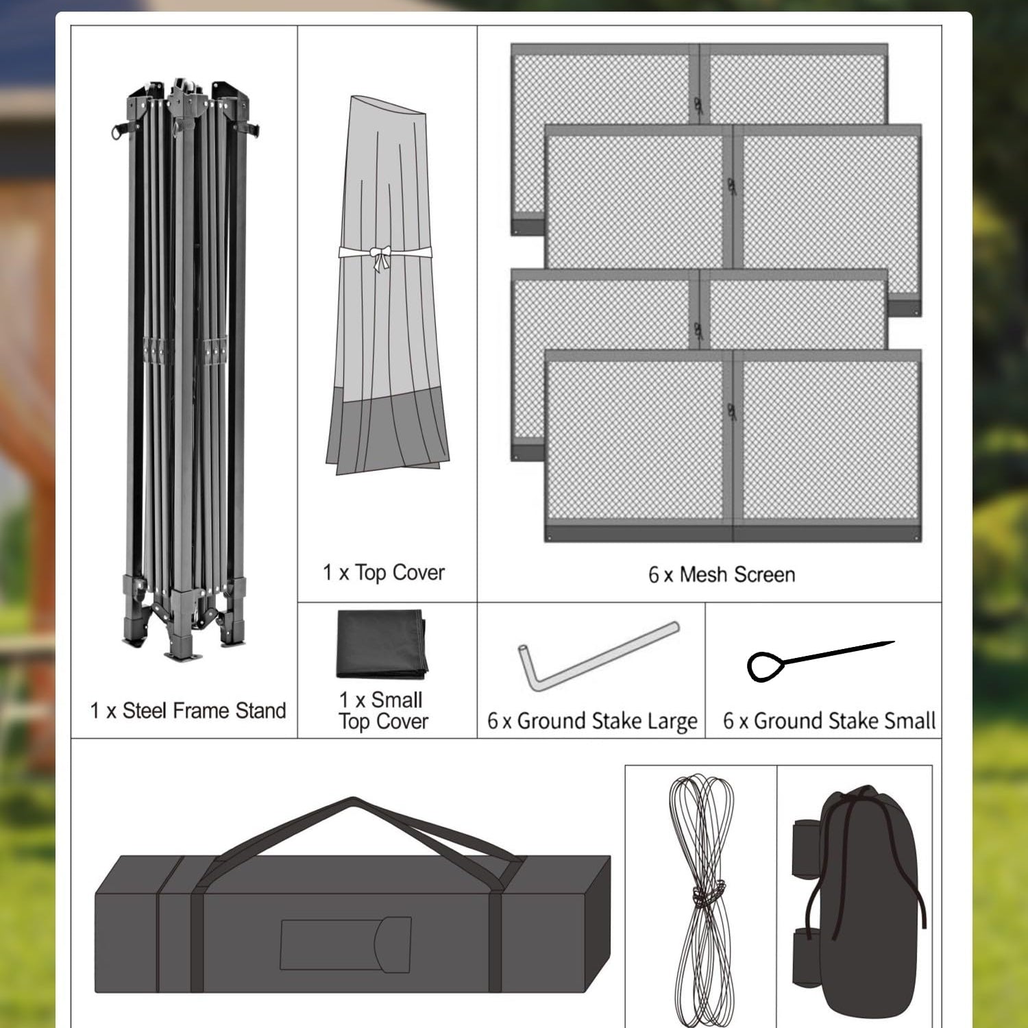 - Package Includes: 1 x Metal Frame, 1 x Canopy Top, 6 x Mosquito Netting with Zippered Doors, 12 x Ground Stakes, 6 x Ropes, 1 x 600D Oxford Fabric Carrying Bag. Our customer service team is always ready to assist you with any questions regarding product use or installation.