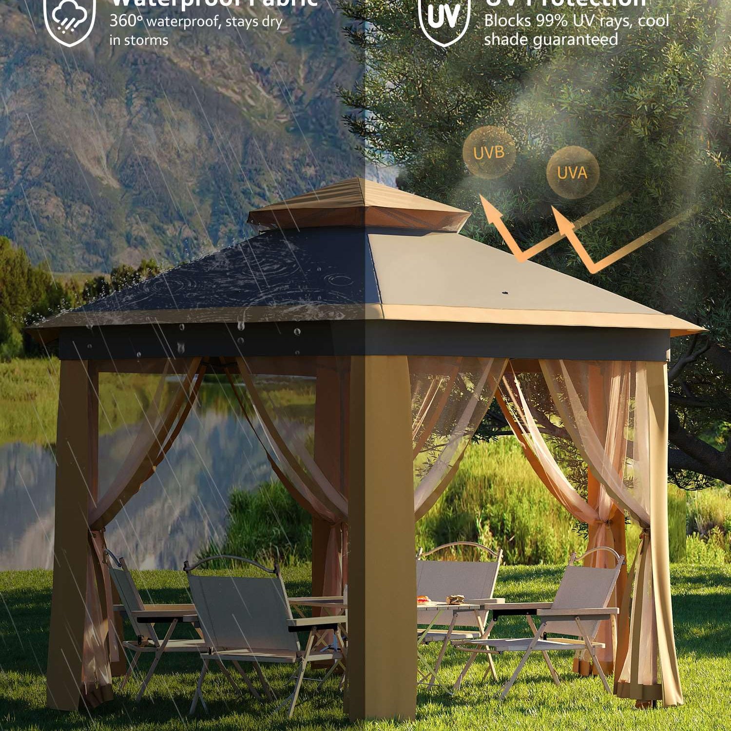 - Premium Materials: The gazebo top cover is made of high-density fabric that blocks 99% of UV rays, keeping the interior cool. This backyard gazebo with mosquito netting provides excellent insect protection while ensuring ventilation. The flame-retardant treatment enhances safety, creating a secure and comfortable environment.