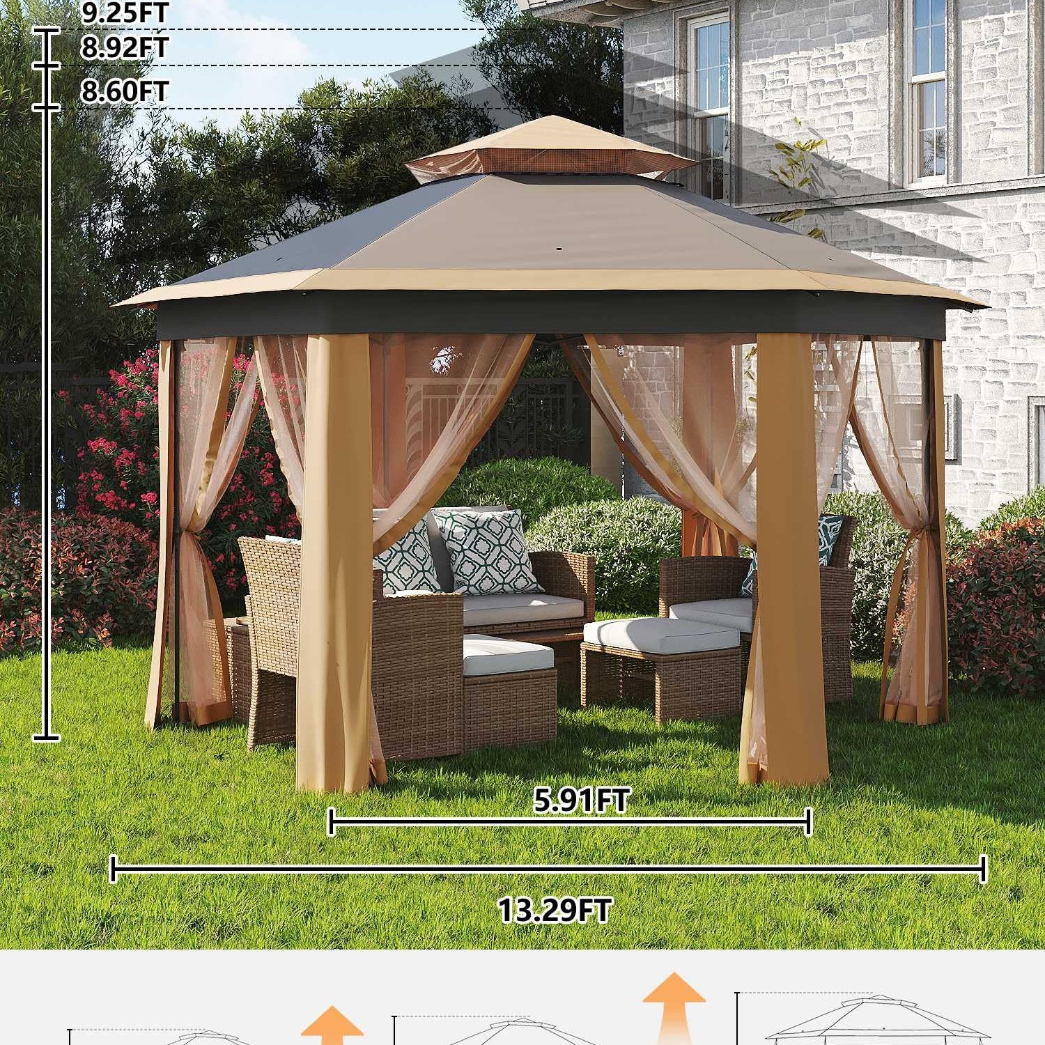 Pop Up Gazebo 13x13Ft, Outside Canopy Tent with 6 Pcs Mosquito Netting, One Push Setup for Backyard Patio Garden Activities - Khaki & Beige