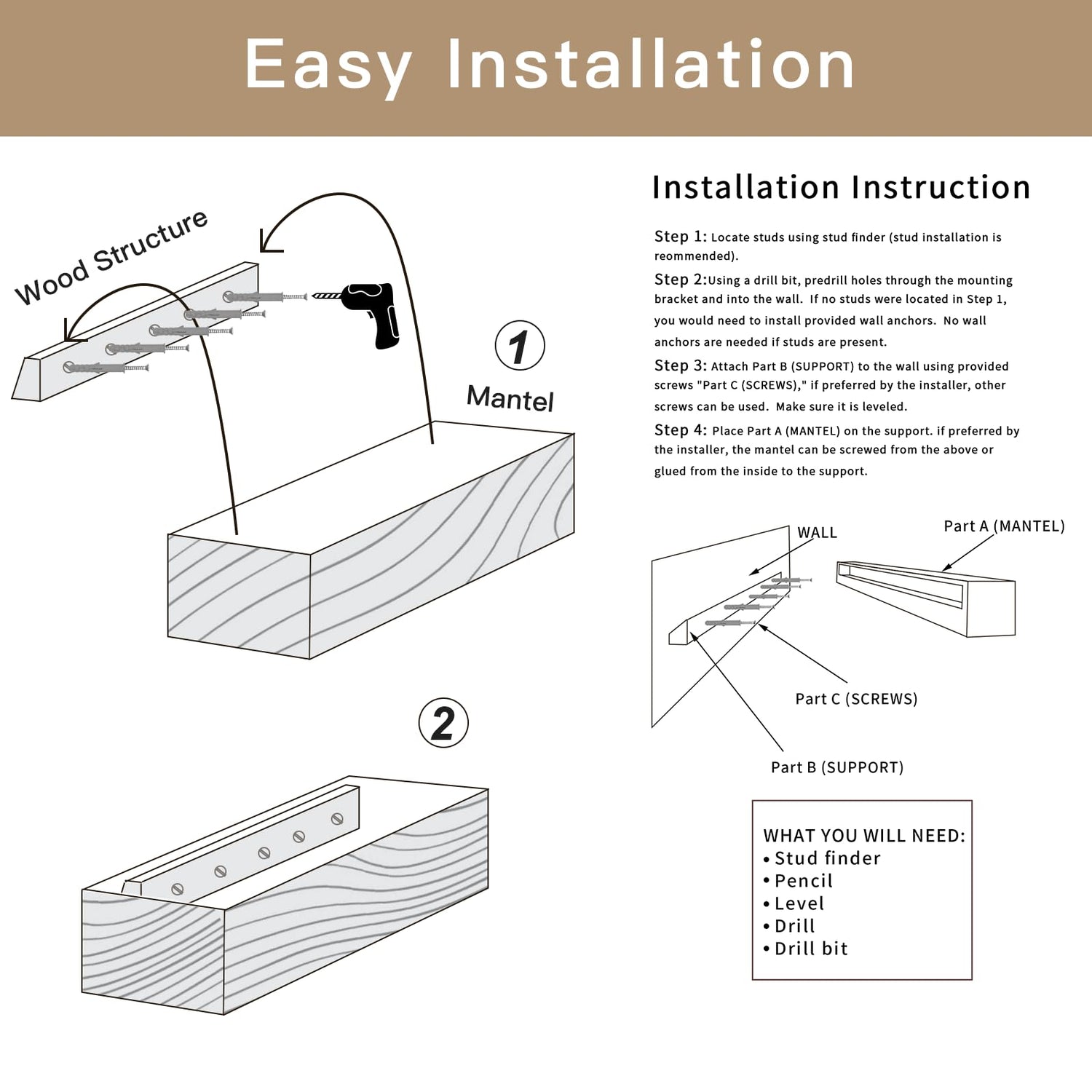 - 【What You Get】You will get mantel, mounting brackets, screws and drywall anchors. Pine wood mantel size 80"x 7.9"x5.9". To make the installation process more easy and quick, you will need: tape measure, stud tester, pencil, level and electric drill bit.