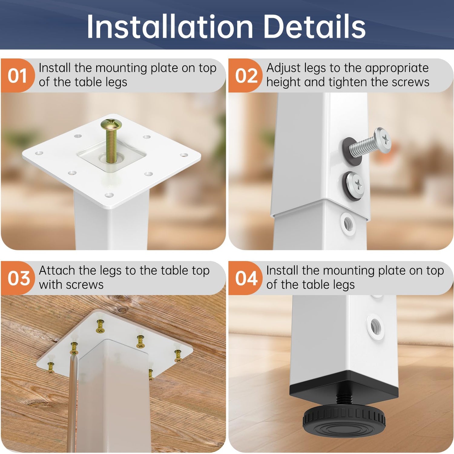 【Easy to install】 :1.Install the mounting plate on top of the table legs. 2.Adjust the Desk Legs to the appropriate height and tighten the screws. 3.Attach the legs to the table top with screws.4.Fine-tune the bottom adjustment screw to help level your table.