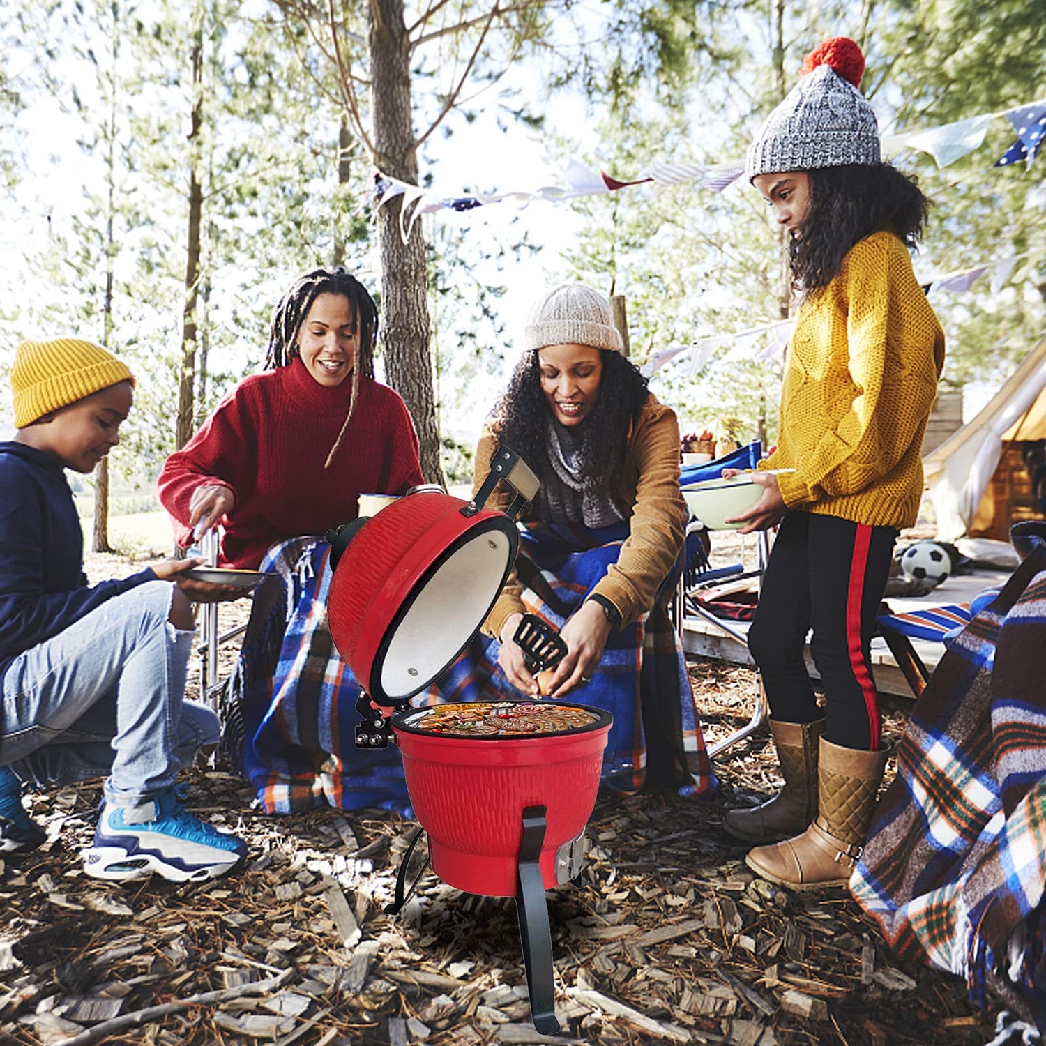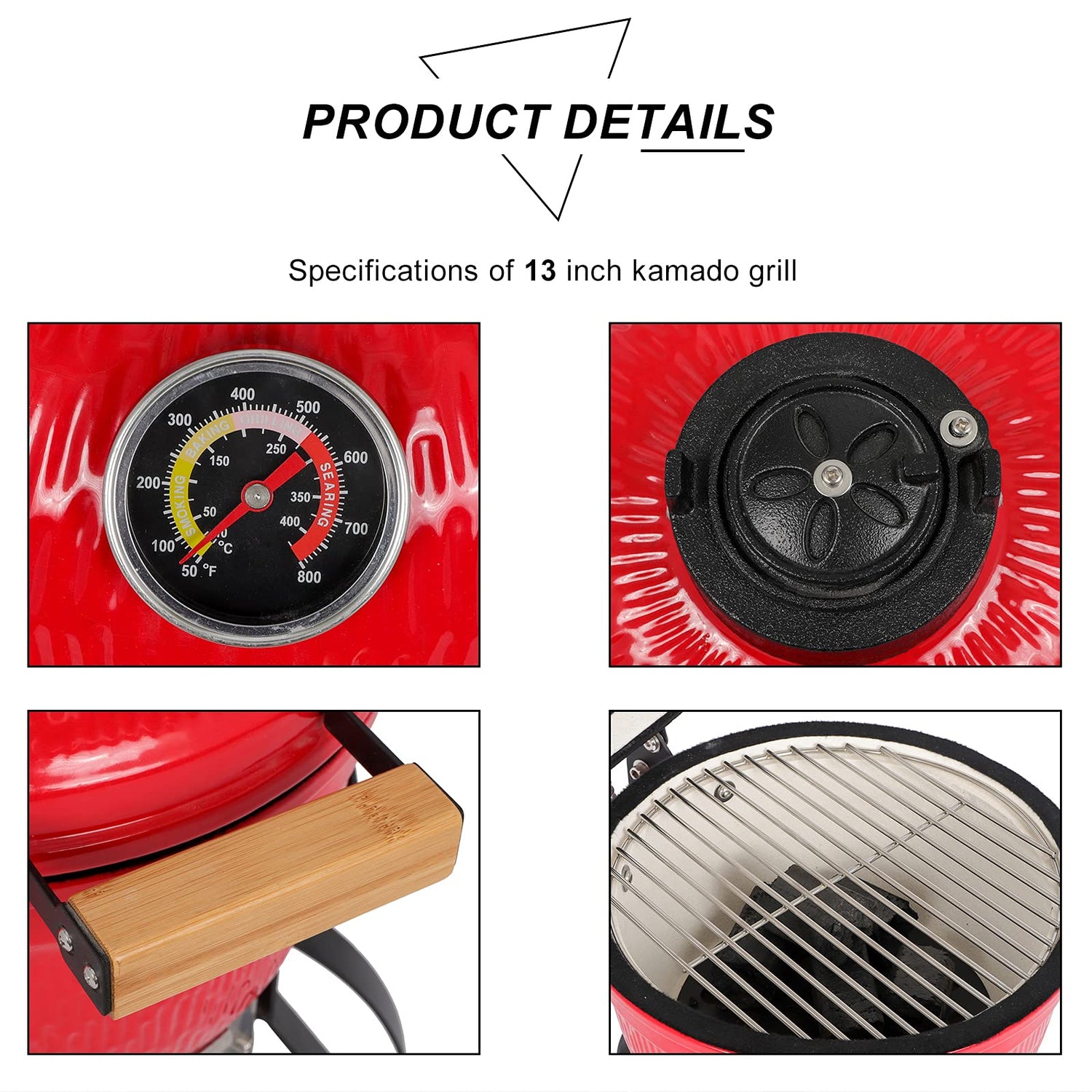 Portable Ceramic Charcoal Grill,13 Inch Outdoor BBQ Egg Grills with Built-in Thermometer, Multifunctional Ceramic Barbecue Grill, Egg Outdoor Kitchen Style (Red)