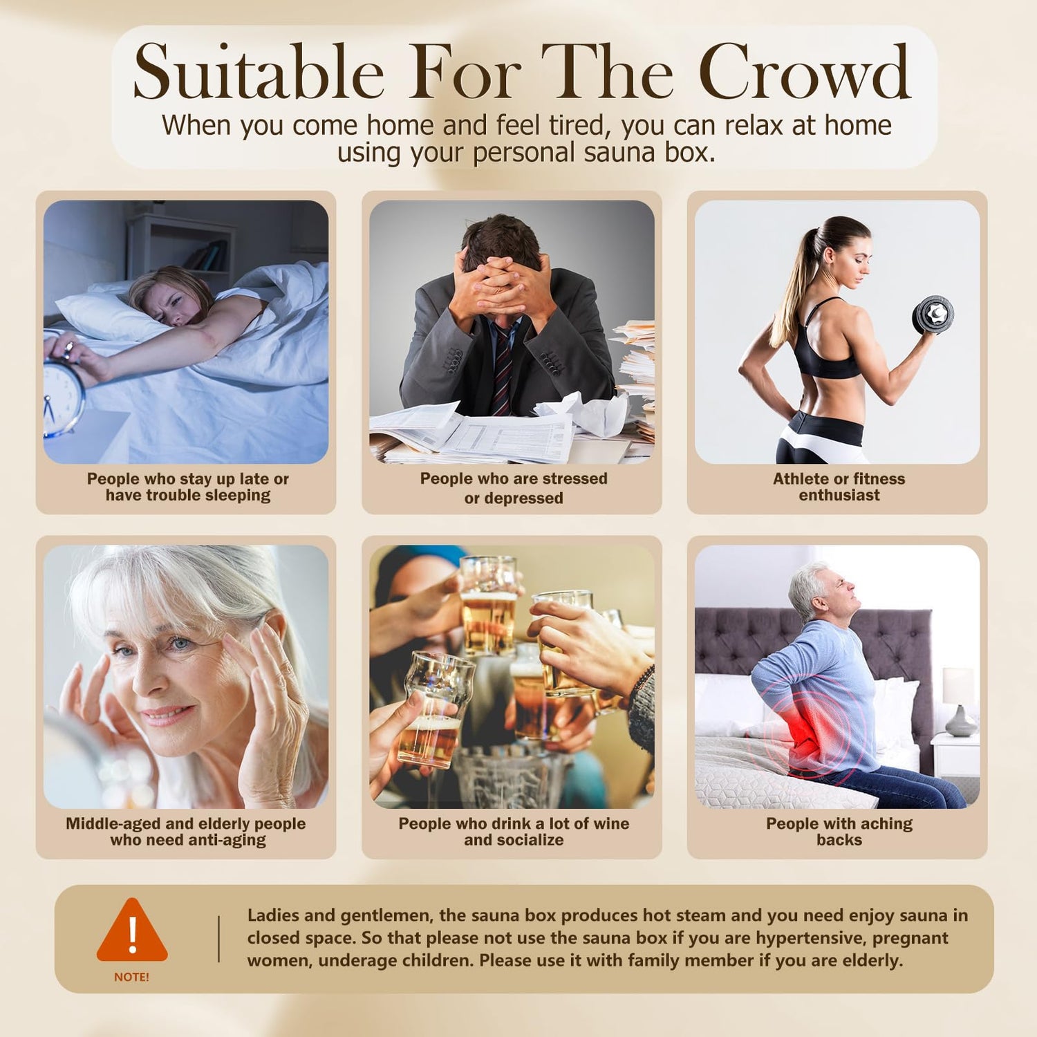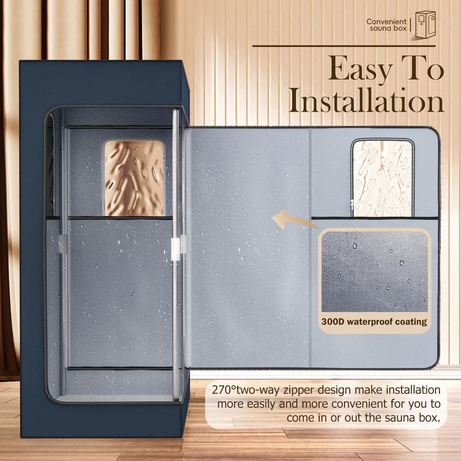 - 【Relax & Health】- The full size personal sauna box gives you a better home SPA experience, saving you time and money. When you come home and feel tired, you can relax at home using your personal sauna box. The heat emitted by the sauna tent box can relieve muscle pain, prevent fatigue, and detoxify the body. It can lose weight, improve skin tone, relieve stiffness and joint pain, improve blood circulation, promote more peaceful sleep, reduce stress. It is ideal gift for your family and friend.