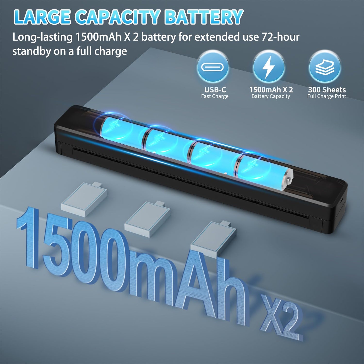 - On-the-Go Printer: Outstanding Print Quality & Robust Battery Life: Delight in precise and vivid prints with our sleek travel printer, furnished with two 1500mAh internal batteries for continuous printing of up to 2 hours or 260 pages on a single charge. With a notable 90-day standby feature, this portable printer is a vital accessory for bustling professionals and students always on the move.