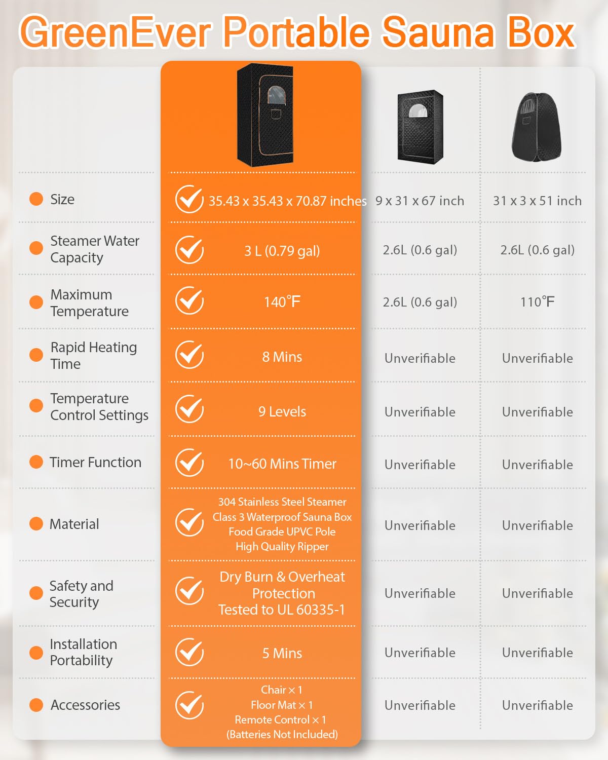 - Spacious Design: The indoor sauna measures 35.4" x 35.4" x 70.9" , making it suitable for adults of various sizes. Equipped with a waterproof folding chair and foot mat, this portable sauna for home allows you enjoy a spa-like experience at home.