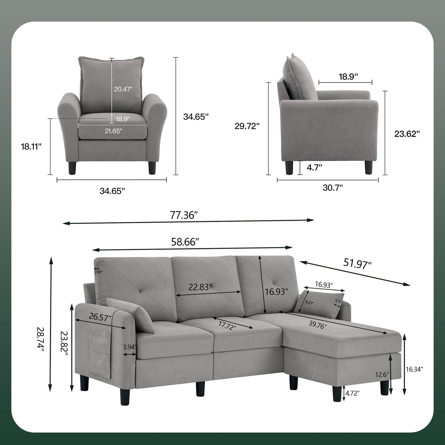 Details: Portaforta Sectional Sofa Set, 77" Convertible Sofa and Accent Chair, Small 3 Seat L Shaped Couch with Storage Ottoman and Side Pockets, Modern Couch for Living Room, Office, Apartment, Light Grey