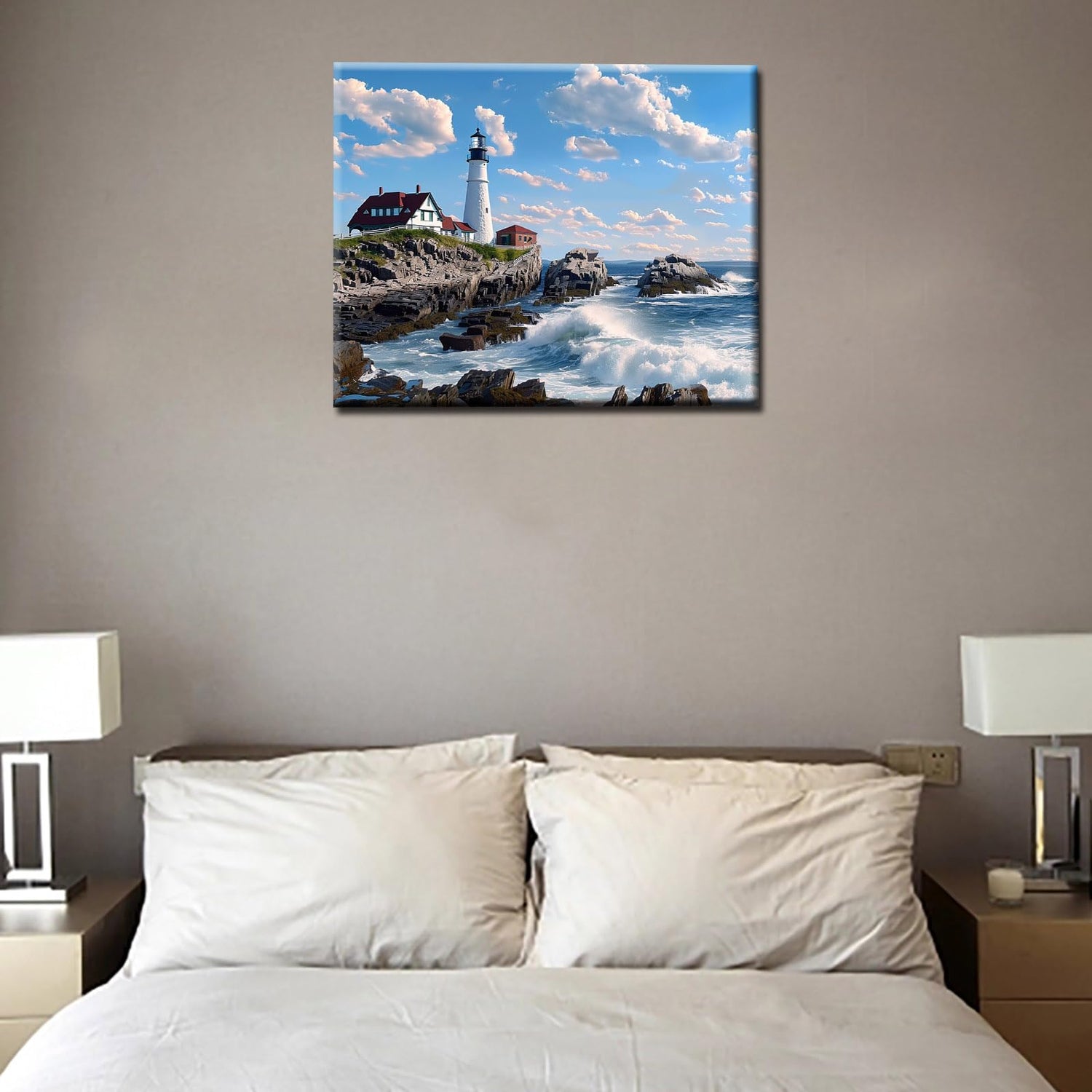 Portland Head Light Paint by Numbers Kits with Brushes America Lighthouse Acrylic Oil Painting for Adults Kids Tropical Seascape Pictures Red House Arts Craft Home Decor Nordics Gift(Without Frame)