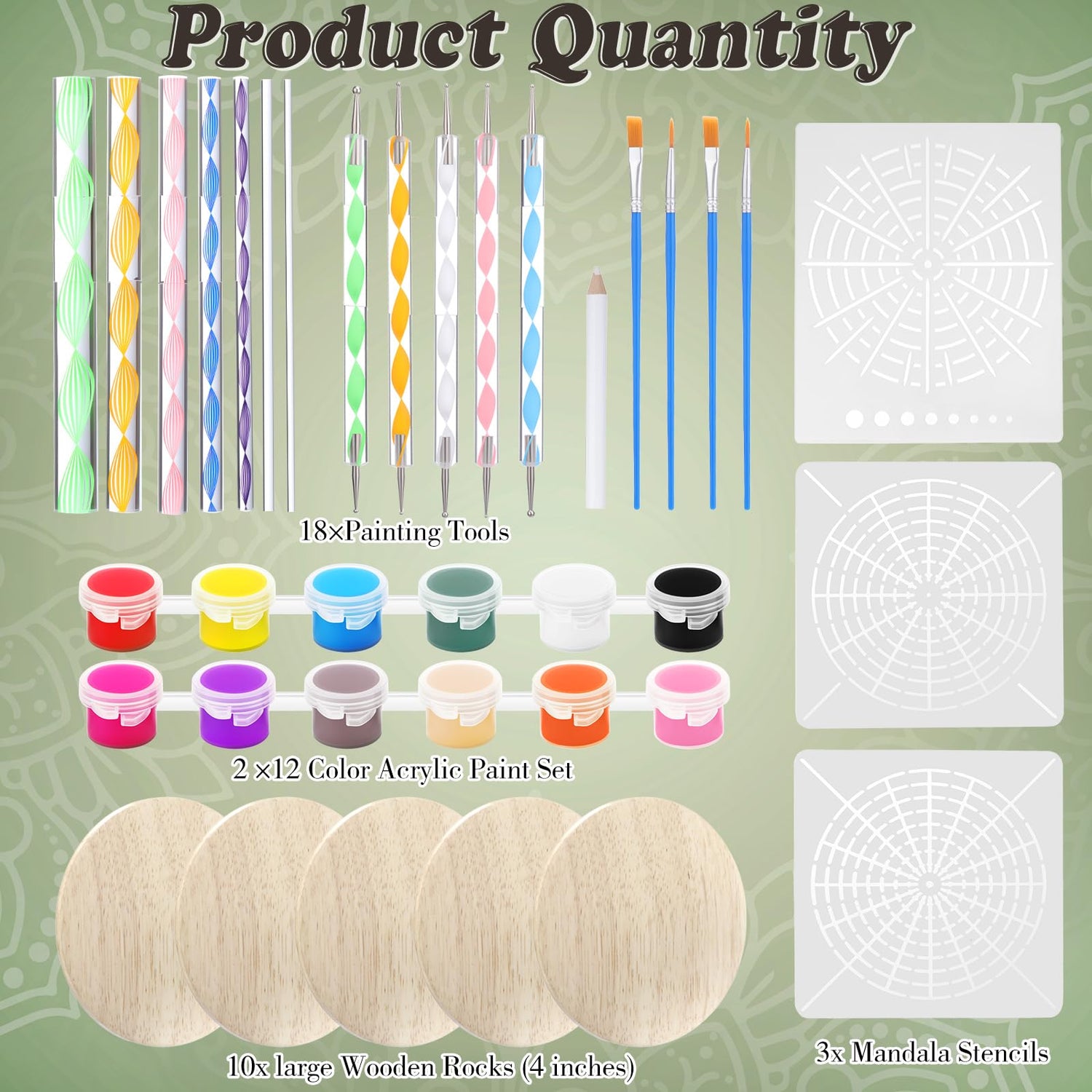 - Comprehensive Creativity Kit: unleash your artistic potential with our complete mandala rocks painting set, including 10 large smooth wooden rocks for painting, 3 universal mandala stencils for rock painting, 13 mandala dotting tools, 2 sets of 12-color acrylic paints, 4 paint brushes, and 1 white chalk pencil; With this comprehensive multi-piece kit, not only can you explore diverse designs, but also create a themed series that reflects your artistic voice