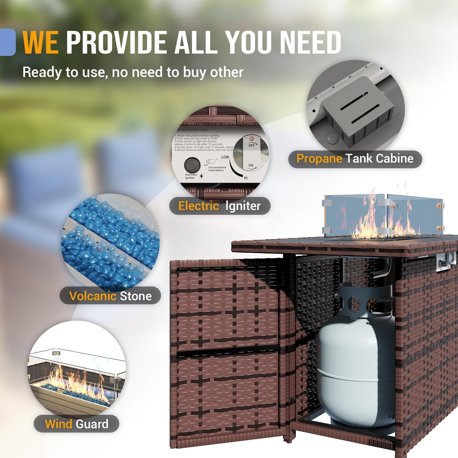 - Auto-ignition fire pit: Patio propane fire pits are CSA certified,uses multiple processes to heat protection, meets all electrical requirements to ensure reliability and safety. Equipped with a high-efficiency burner, integrated push-button ignition, easy start and heat up to 55,000 BTU. The gas fire pit table features an extended table top, comes with a bonus glass wind guard for use as an outdoor dining or coffee table.