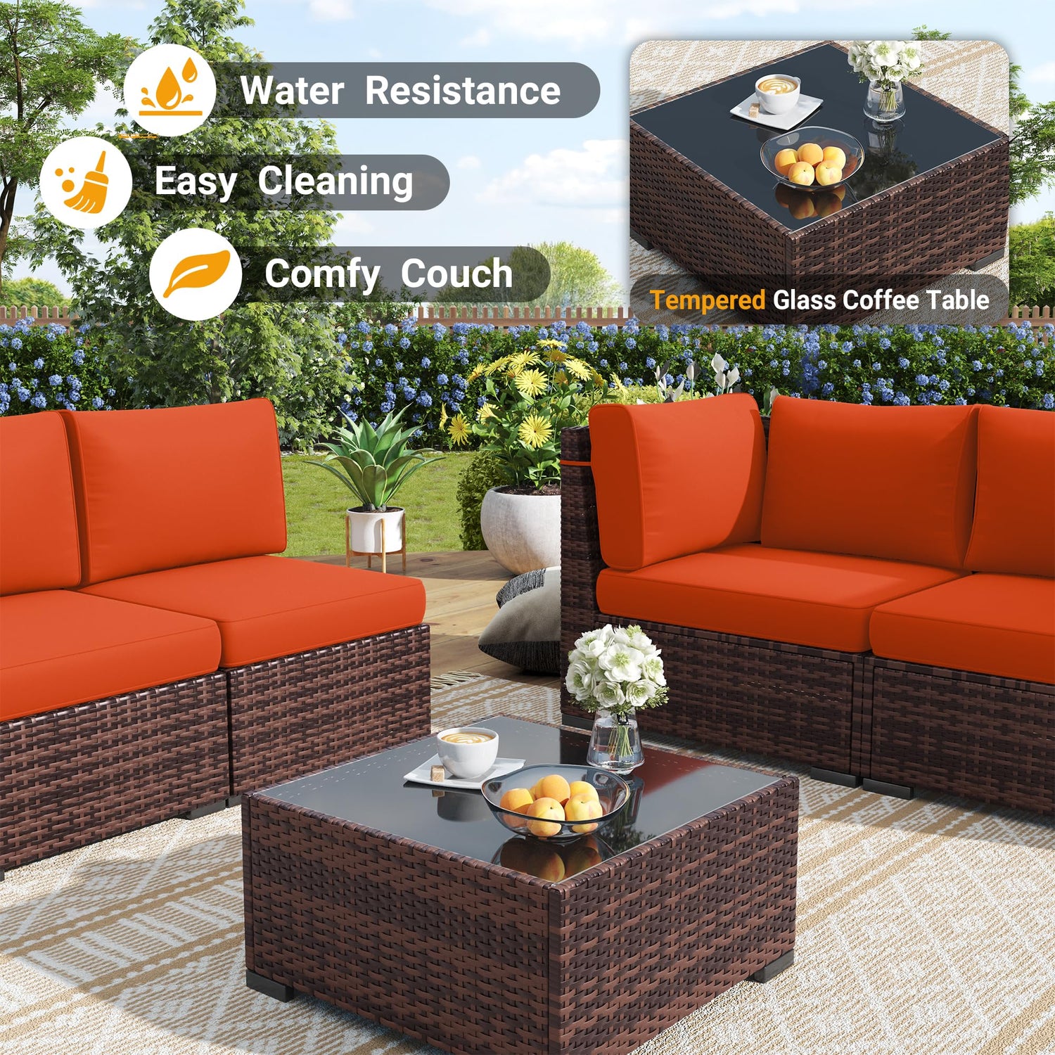 Poteban Outdoor Patio Furniture Set with 44" Fire Pit Table 8 Pieces Rattan Patio Sectional Sofa Conversation Set w/55000 BTU Propane Gas Fire Pit, Coffee Table, 2 Waterproof Covers, Orange