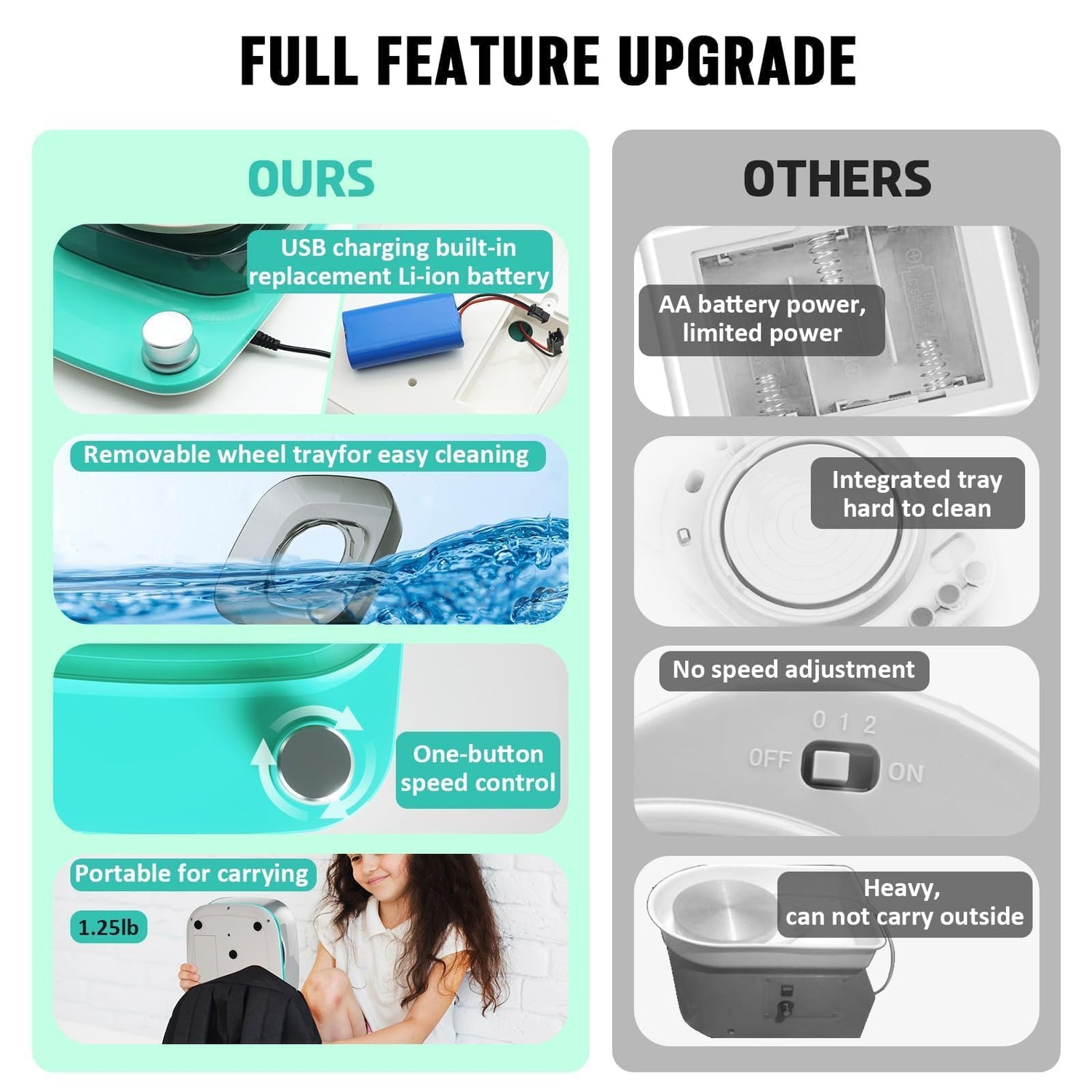- 🚀 Ultralight & Mobile: Bring your pottery to life anywhere inspiration strikes. Thanks to its featherlight build and dependable battery operation, our pottery wheel is supremely portable. From classrooms and friends' places to your personal art space, this wheel makes creating accessible anywhere, opening up a world of artistic potential.