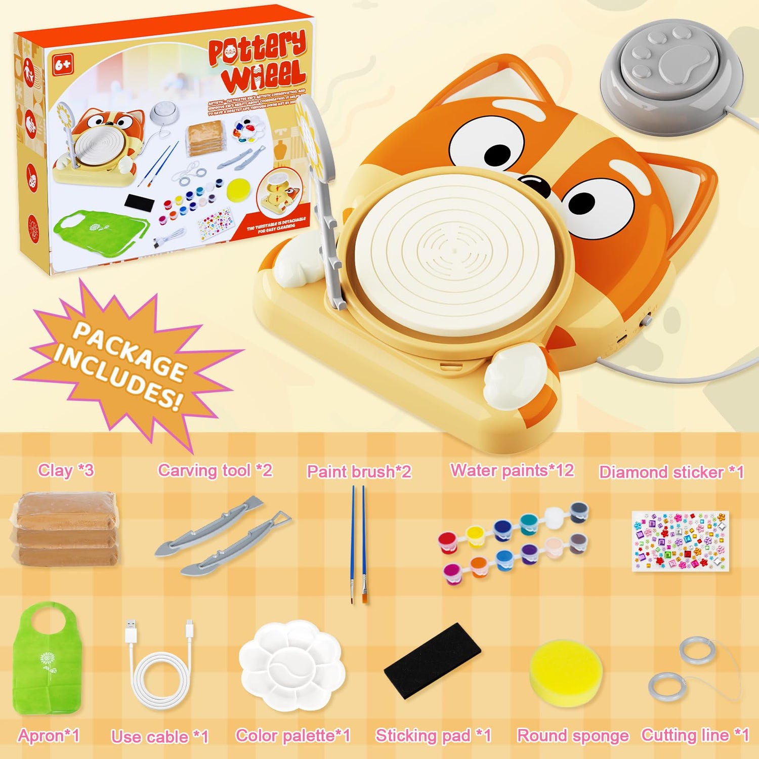 - đ¨ăCOMPLETE POTTERY EXPERIENCEăOur kids pottery wheel kit offers a full spectrum of pottery tools, including a pottery wheel, 3 packs of air dry clay, sculpting tools, paintbrushes, and a 12-color palette. Designed for kids and adults, this kit invites you to shape, mold, and decorate your creations, transforming raw clay into stunning pottery art.