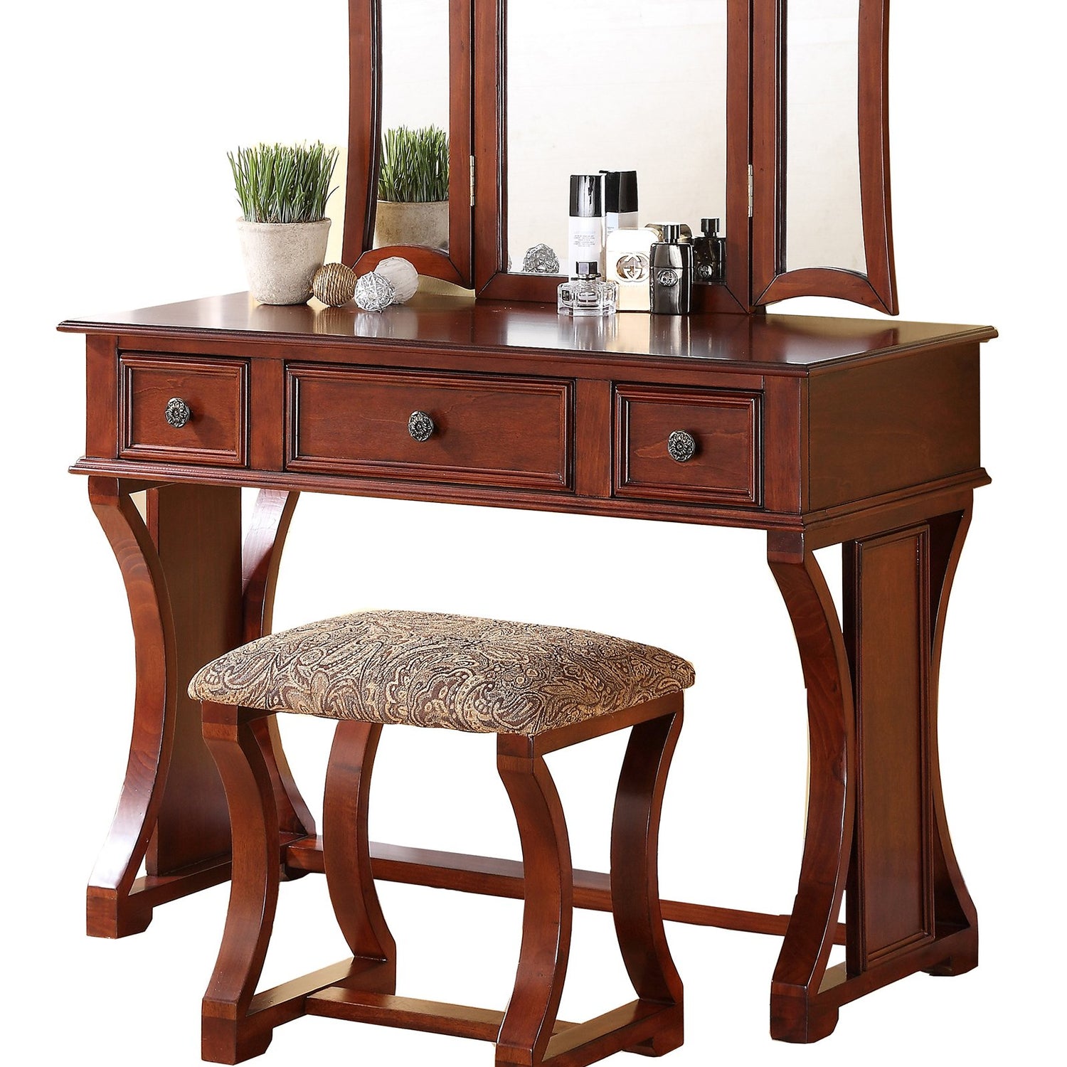 Details: This beautifully designed vanity set features pine wood frame of rustic style. It includes a 3-panel mirror, table with functional drawers, and a cushioned stool. Each pieces is framed in feminine curves and lines making it the perfect addition to your bedroom. Available in black, apple green, cherry, and white.