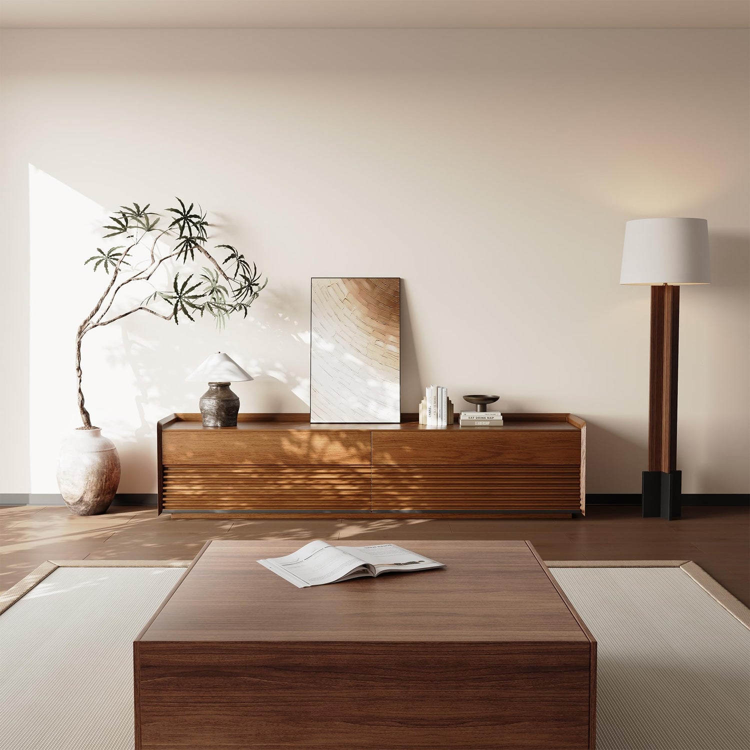 - 【Elegant Medieval-Modern Design】 Elevate your living space with our stunning media console, featuring a captivating walnut wood finish and intricate parallel wood strips on the lower half for a perfect blend of vintage and modern aesthetics.