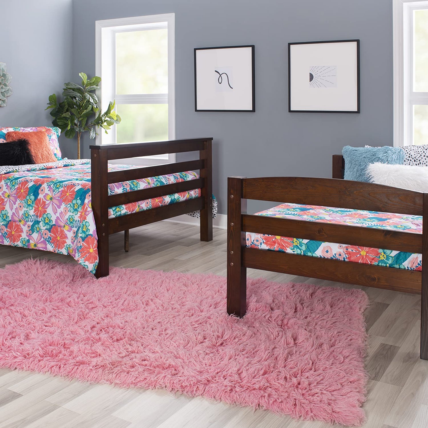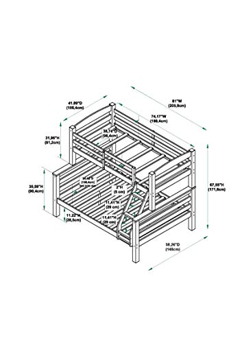 Crafted from solid pine wood, this bunk bed is designed for unmatched durability and longevity. The sturdy 3.25" thick hardwood posts and heavy-duty solid pine slats (seven for the top bunk and thirteen for the bottom) support a maximum weight of 800 pounds across both bunks. Each sleeping surface accommodates a mattress with a maximum height of 8 inches, eliminating the need for a bunkie board, though a bunkie board is required for full foam mattresses.