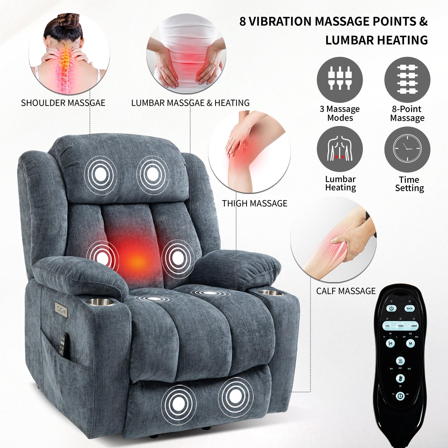 - MASSAGE & LUMBAR HEAT FUNCTIONS : The power recliner chair comes with 8 vibrating nodes (back, lumbar, thighs, legs) and 3 massage modes for selection, each massage point can be operated individually. You can choose to massage a specific part separately. There is timer function in 15/30/60 minutes which is convenient for you to set massaging time. Add a lumbar heat point to promote blood circulation throughout your body, providing a full body relaxation!