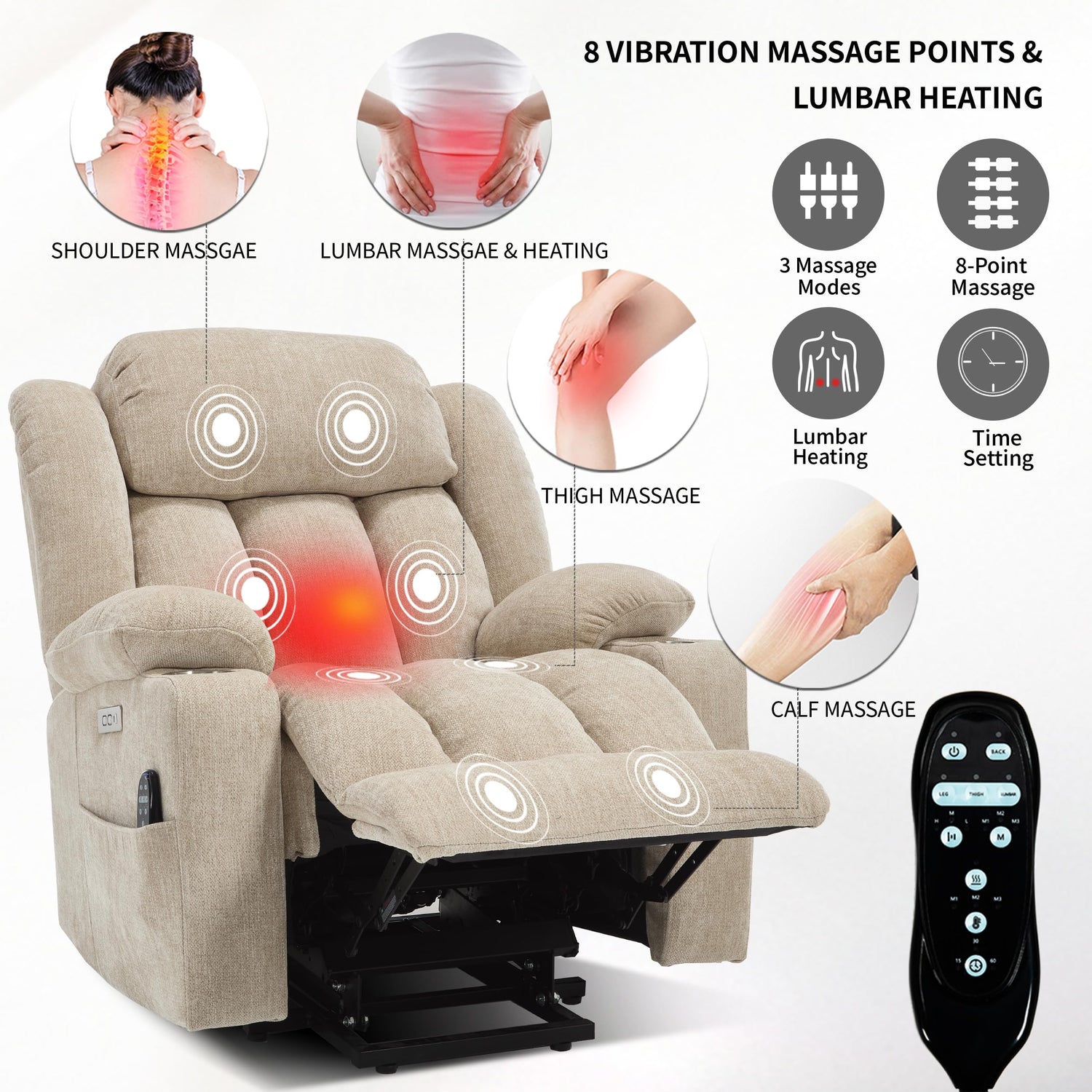 - MASSAGE & LUMBAR HEAT FUNCTIONS: The power lift chair comes with 8 vibrating nodes (back, lumbar, thighs, legs) and 3 massage modes for selection, each massage point can be operated individually. There is timer function in 15/30/60 minutes which is convenient for you to set massaging time. Add a lumbar heat point to promote blood circulation throughout your body, providing a full body relaxation!