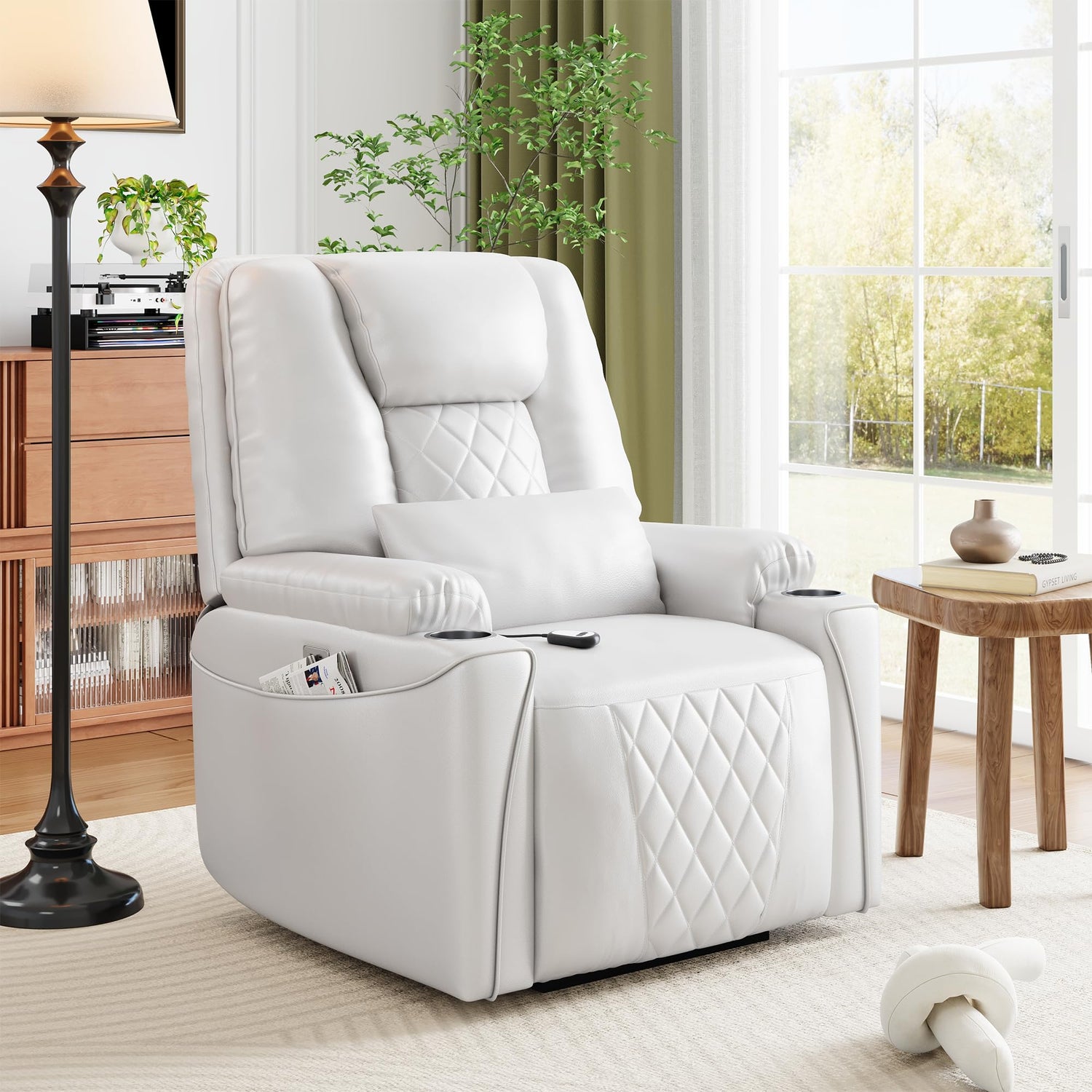 Crafted with elegant functionality, the chair features premium padded armrests, an ergonomic headrest, and durable, easy-clean fabric that maintains its sophisticated look. Thoughtful touches include hidden side pockets for remote storage and integrated cup holders that keep drinks secure during family movie nights.
