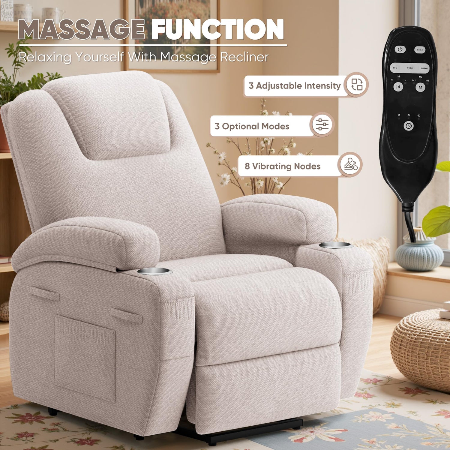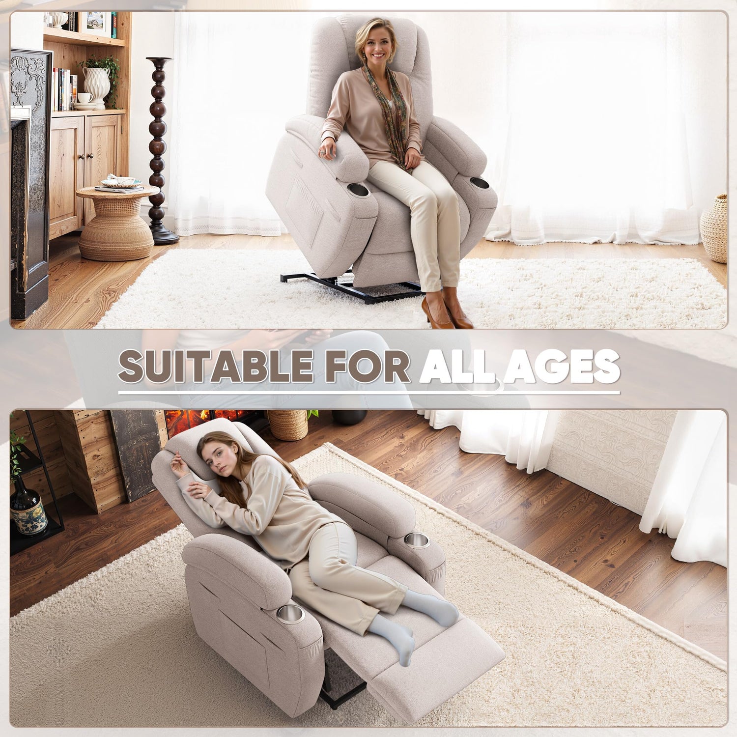 Power Lift Recliner Chair with Massage Electric Lift Chair for Elderly, Ergonomic Recliner with Cup Holders & Side Pockets, Modern Single Sofa for Living Room (Fabric, Beige)