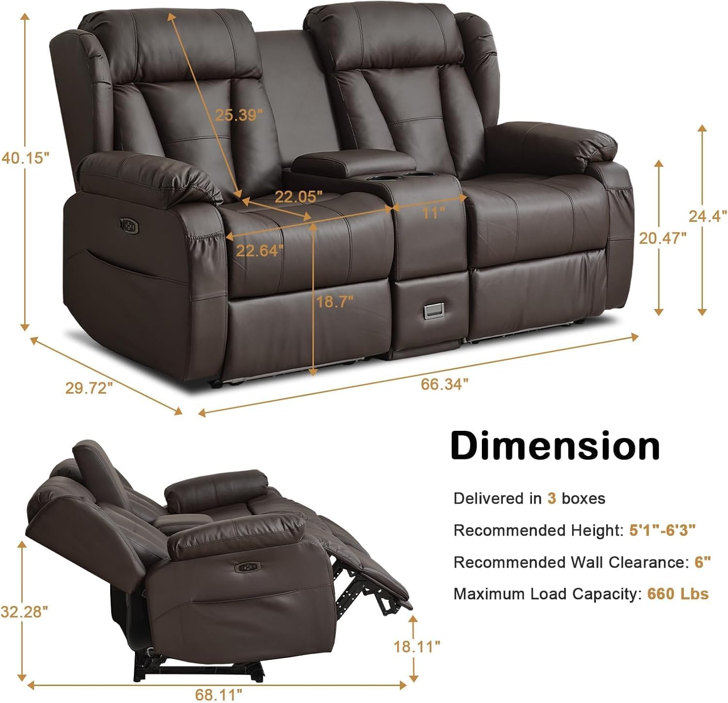Power Loveseat Recliner Sofa, Home Theater Seating with Console,Reclining Loveseat Sofa RV Couch with LED Lights, Cup Holders, USB, Drawer, Faux Leather for Living Room