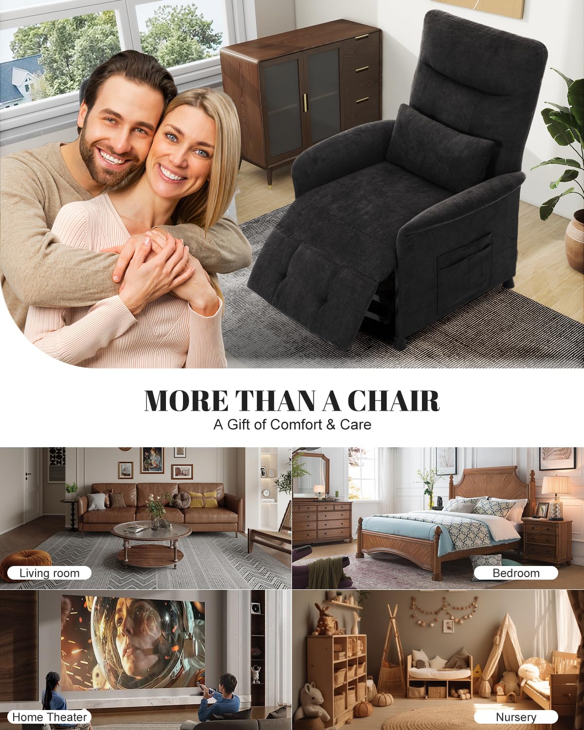 - 【Additional Features】 This recliner offers a spacious 21.26'' x 21.26'' seating area, perfect for adults to relax in. Its three side pockets provide convenient storage for your phone, tablet, magazines, and more. The classic, minimalist design complements various home decor styles, and the low-noise motor ensures a quiet and peaceful experience.