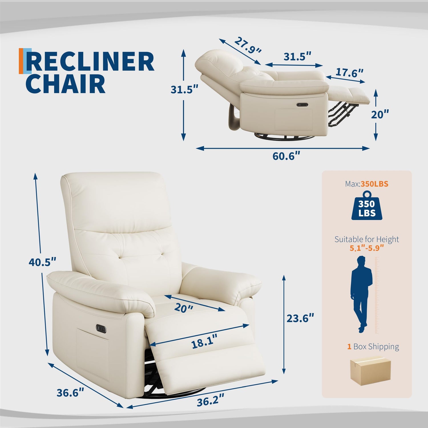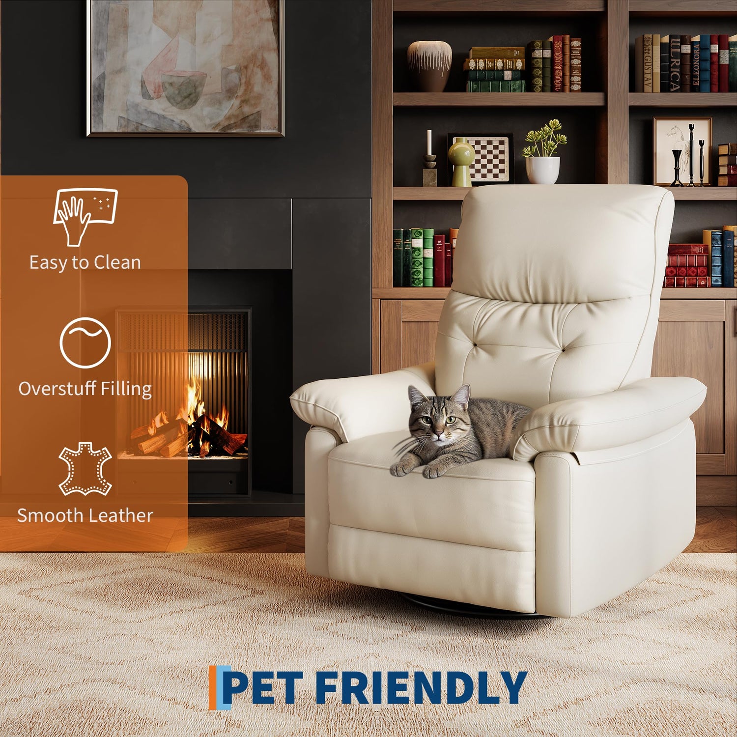 Power Recliner Chair for Adults, PU Leather Swivel Rocker Recliner with Padded Armrests & Side Pocket, Modern Upholstered Reclining Glider Chair for Living Room or Nursery (White)
