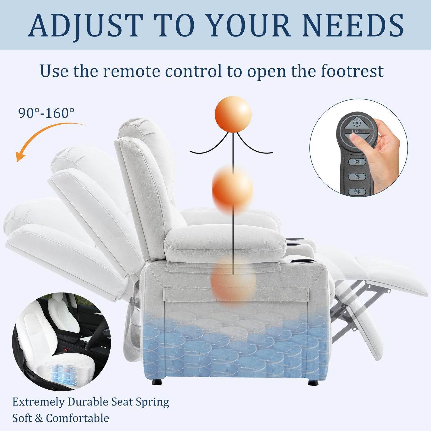 - 【Comfort Heated Seat】The power glider recliner chair is designed with people's comfort in mind, the footrest and a heating point can be easily activated with the push of a button.The 90-135°recliner angle offers flexibility and versatility for maximum comfort.The chair's backrest adopts a carefully designed segmented structure,providing targeted support for the upper and lower back,effectively dispersing pressure and reducing back fatigue and discomfort.