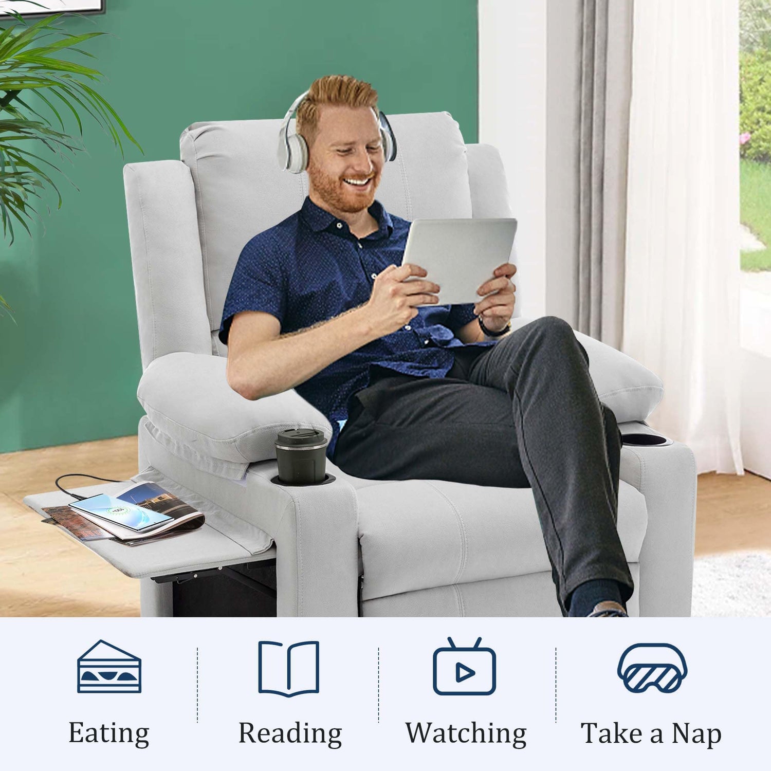 Power Recliner Chair for Adults,Upholstered Nursery Reclining Sofa Chair,Heating Point Massage Theater Seating Single Sofa with Side Pockets Table for Living Room-Grey White