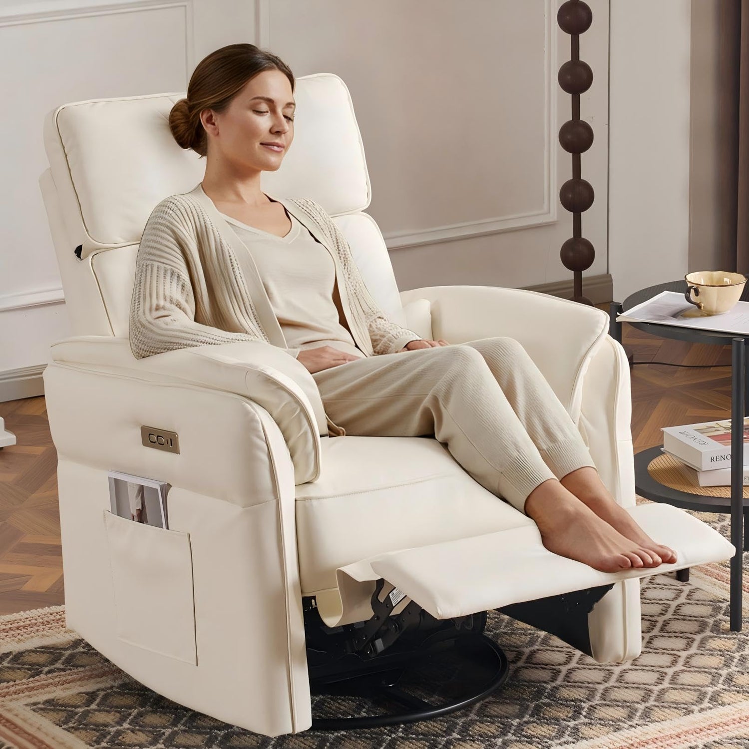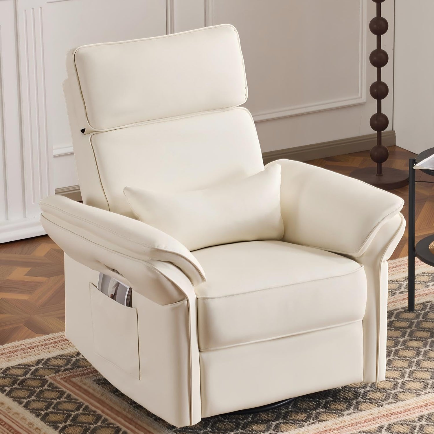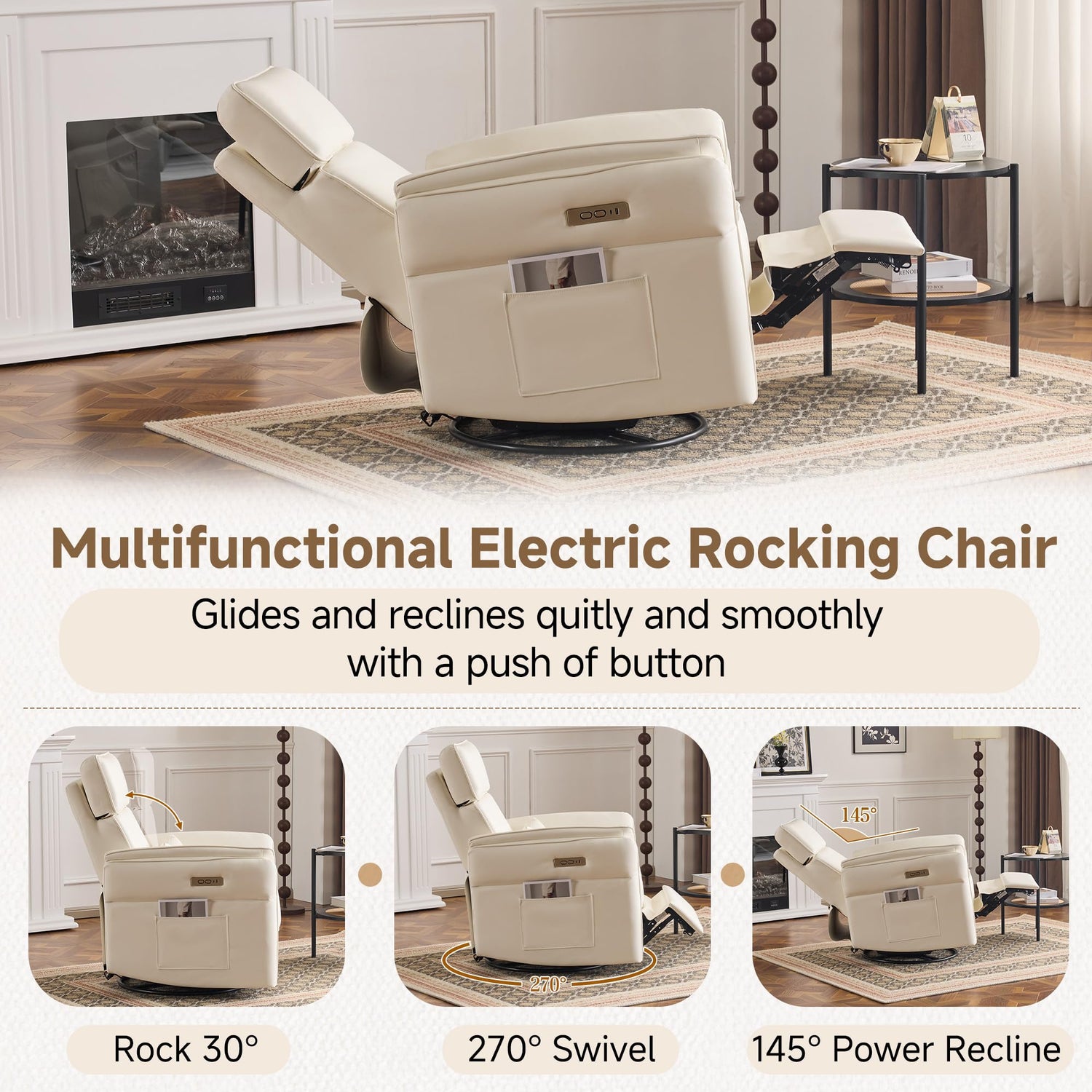 - [Swivel and Rocking Motion]The power glider swivel rocker recliner chair is designed with Mom's comfort in mind, featuring a 270-degree swivel and 90-145° recliner angle, silent gliding mechanism with one-touch operation, offers flexibility and versatility for maximum comfort, plus includes an extended footrest for complete relaxation, making it perfect for activities such as watching television, sleeping, and reading.